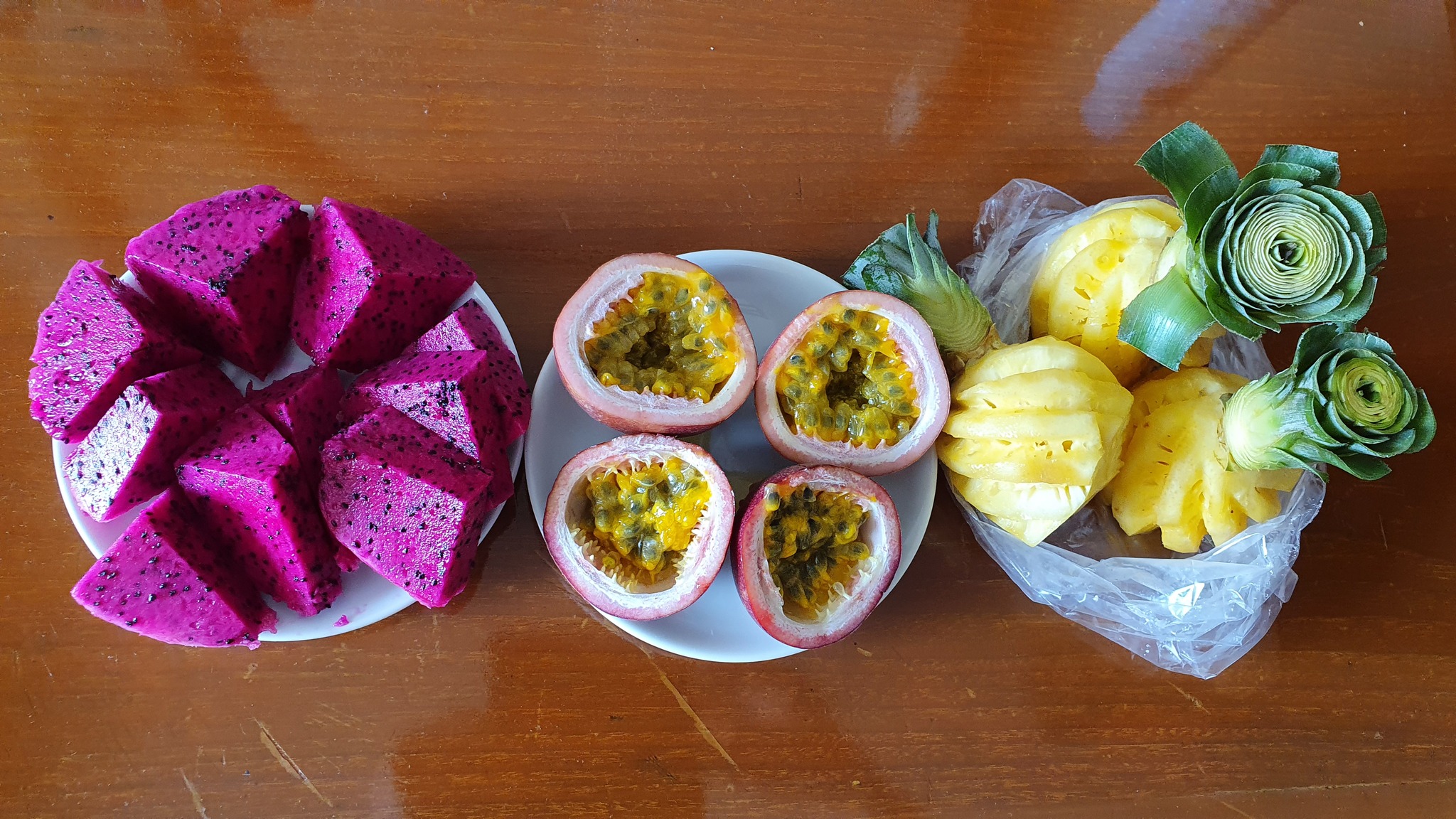 Ах, да - на десерт фрукты обязательно. В ассортименте: арбуз, папайя, питайя и ананас.