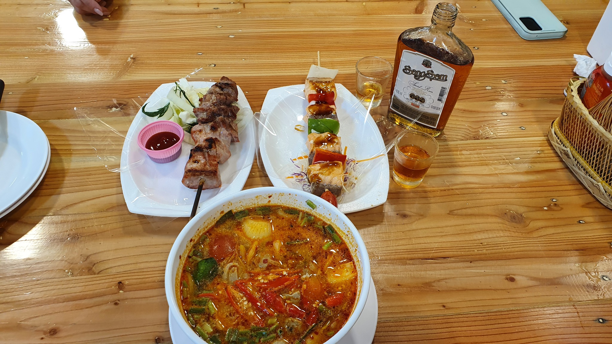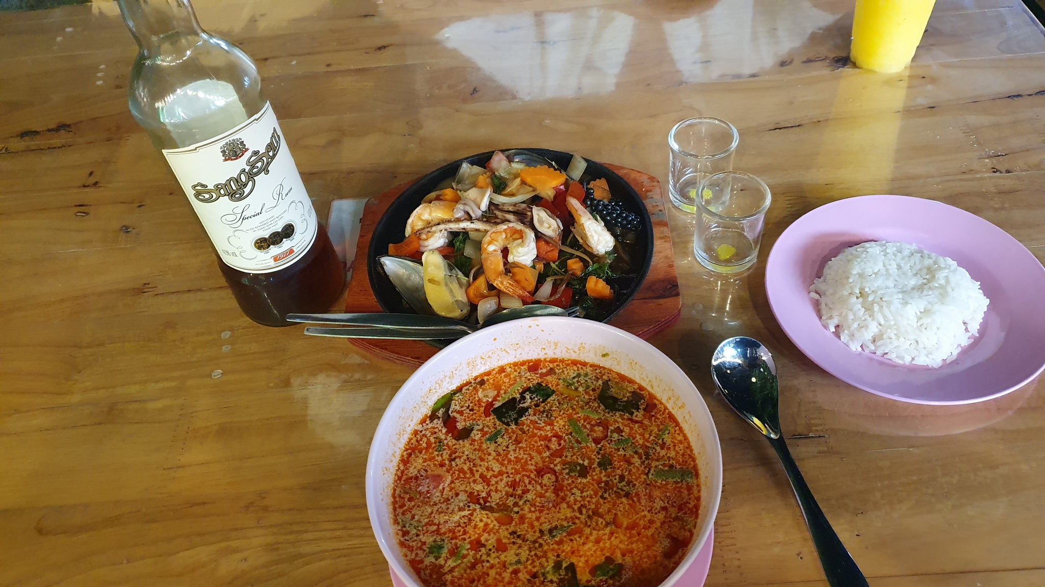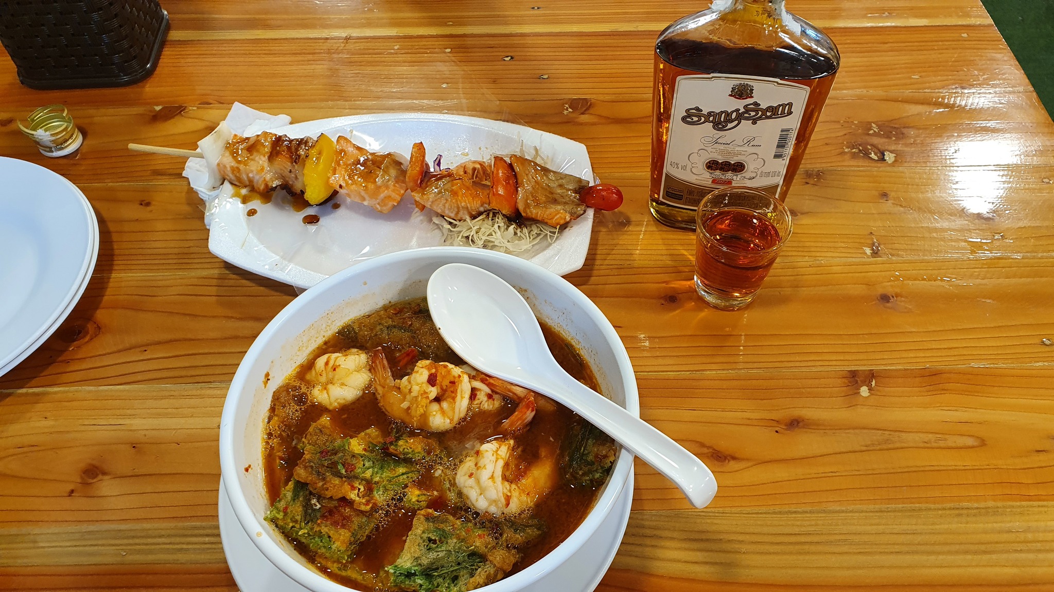 О-оо!, говорю жене, - сегодня нам сюда! А у меня от рыбалки половина бутылки 0,7 того же SangSom осталась ;-)) Пока жена заказывала, я в отель сбегал и притащил её.