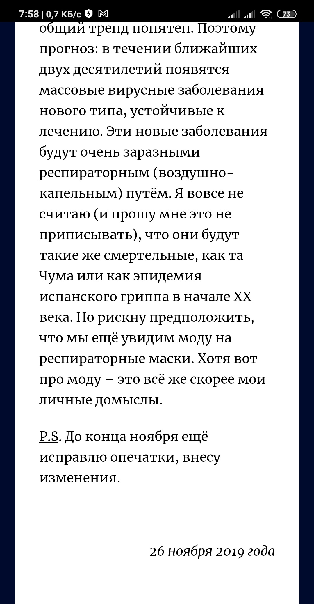 Вот тоже попадалось что-то подобное в октябре-ноябре 2019 года, какой-то мужчина предсказывал эпидемию/пандемию в 2020 году, что она продлится весь год. Обещалось то, что победить болезнь удастся не раньше, чем через 1,5-2 года.