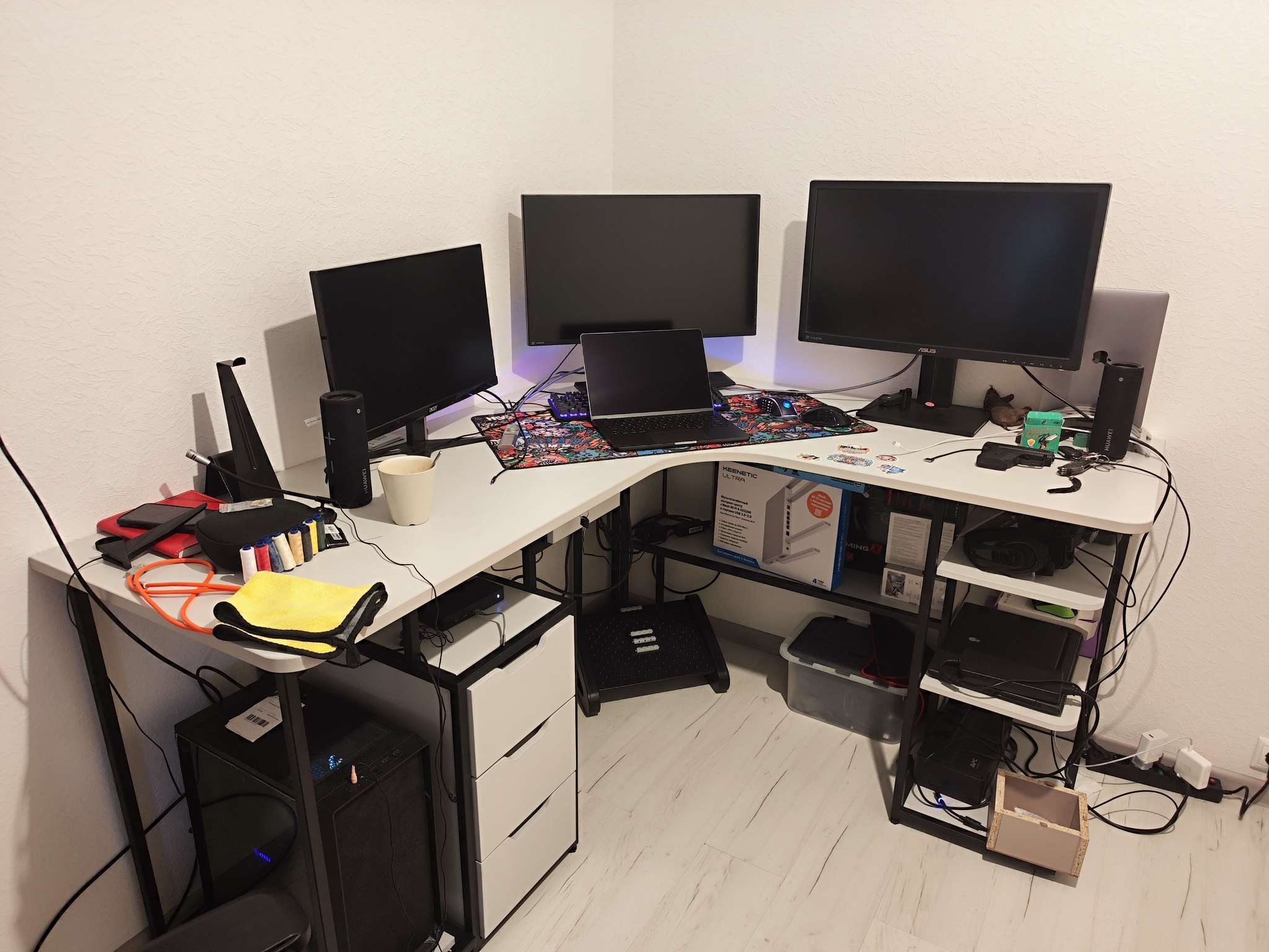 Справа asus pb278q, взял с первой зп очень давно, он 60гц и srgb, по центру я взял для apex legends, там 2к и 144гц asus vg278