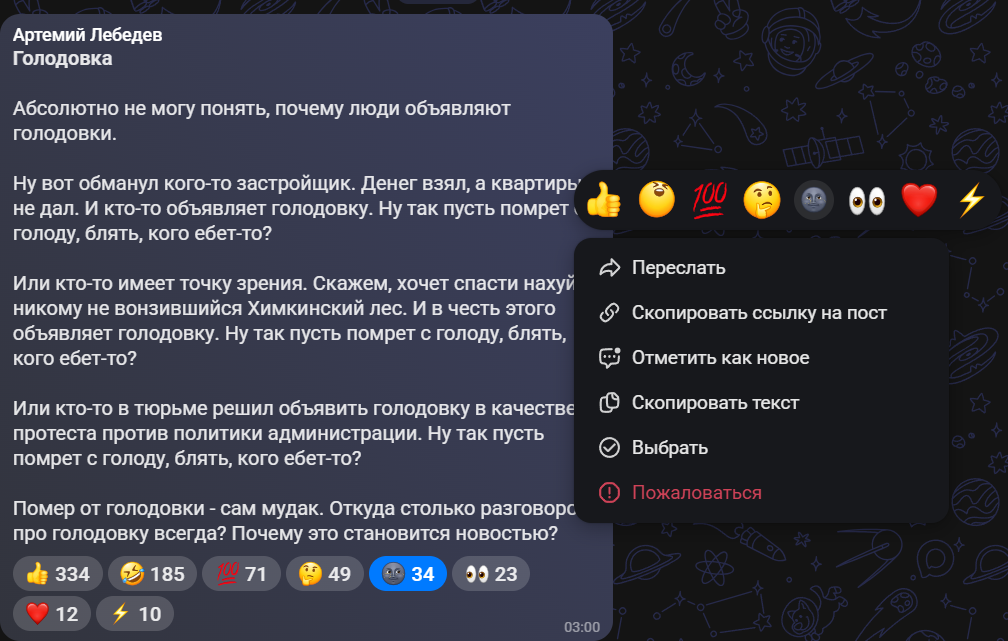 Не ну я в целом часто согласен с его высказываниями, но прости @temalebedev ты там на новый год что бухал? Оно точно на мозг не повлияло? идея голодовки, она как-бы в том, чтобы ЗАЯВИТЬ, ВЫРАЗИТЬ ПРОТЕСТ, ПРИВЛЕЧЬ ВНИМАНИЕ. Ну ладно, согласен, ты не подумал про это... но нихуя, ты подумал, а знаешь почему? потому что ссыкливо выключил подходящие реакции