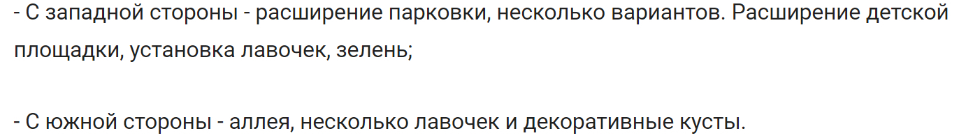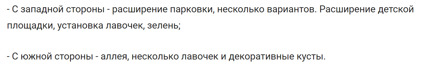 - С западной стороны - расширение парковки, несколько вариантов. Расширение детской площадки, установка лавочек, зелень;