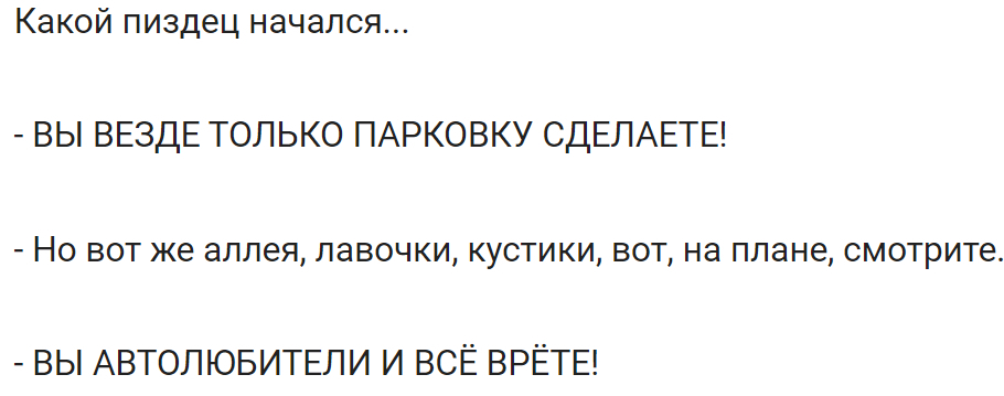 Письма писали, что один из оргов движухи устраивается работать в администрацию, чтобы завладеть землёй ТСЖ и сделать платную парковку. Короче, наилютейший бред. Мы когда читали, давились кроваво-гневными слезами.