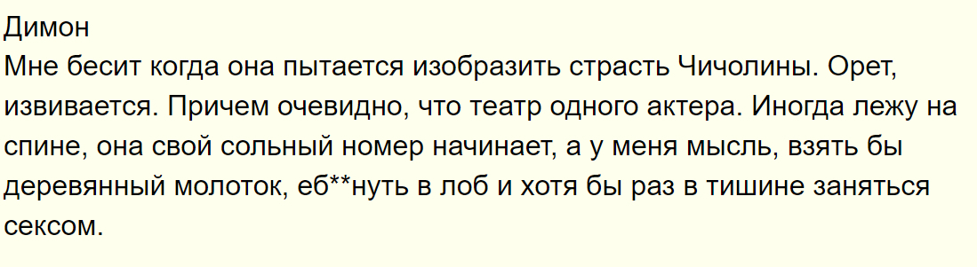 Настало моё время. В браке 8 лет. Первое время трахались во всех позах, везде где можно и нельзя. Со временем сошло на нет. Секса могло не быть по пол года. Я чувствовала себя ущербной.Многие женщины меня, к сожалению, поймут. От мужа не то что секса, даже обычного прикосновения не дождешься. Хотелось лезть на стену. Так длилось 4 года. Все потому что родился ребенок, потом второй. Секс ведь не сразу прекратился, но звоночки были именно во время первой Б, я думала что просто боится навредить, мало ли какие тараканы у него, хотя я и обьясняла что это безопасно. Но сильно мы прям не срались, вроде терпимо. Потом сами понимаете, послеродовый период, кормление, усталость моя и его, но секс все же был, хоть и редкий. Забеременела вторым, у нас теперь погодки. Ну я думаю, дом есть, быт налажен, мы хорошо справляемся вместе, так что спокойно родила второго. Ну и всё, пиздец. Прошло пару лет, секс был раз в 4-5 месяцев. За всё это время я много над этим думала, и до меня дошло: моим сексуальным воспитанием еще в подрастковом возрасте занималась моя родственница, старше меня в два раза (с мамой в этом были сложности, она закрытый человек), а она женщина с высоким либидо. Там дамочка без комплексов, рассказывала о самых интимных подробностях. Она топила за то что мужикам нужен секс как воздух, что для женщины секс хорош для здоровья, что надо трахаться как кролики, а если секса нет, то это конец браку, счастью и вообще, армагедон.. Ну и между строк читалось что хочет=любит, одного без другого не бывает. Ну и я, тогда ещё малолетка, лет 15, безсознательно сделала себе вывод что секс просто необходим. А когда я начала всё анализировать, уже в 27, то до меня дошло, что ВООБЩЕ-ТО секса можно не хотеть. Пришло озарение, что оказывается я сама не так сильно и хочу того секса и мне вполне достаточно раз в 3-4 недели. И что вести себя как тигрица тоже не обязательно! И что со всеми бывшими мужчинами, и с нынешним мужем мои представления о сексе были ошибочными. Нужно делать то что на самом деле нравится! В моём случае, мне всегда не хватало прикосновений к тому самому, чего некоторые мужчины никак не могут найти. Я начала сама это делать в процессе секса. Муж охуел. Я перестала наиграно стонать (раньше делала это безсознательно), лезть к нему, перестала вообще говорить на тему секса, перестала париться если у меня вдруг ноги не побриты. Я начала думать о себе, в делах касаемых сексуального удовлетворения. И что имеем сейчас? Гармонию! Нам обоим, оказывается, не нужен частый секс. Теперь ОН меня хочет, а я уже смотрю по настроению, иногда могу просто сказать "прости, нет настроения" и никто не обижается, ведь это даёт и ему свободу спокойно мне отказать, если ему не хочется. Все по обоюдному согласию, никто не считает себя ущербным, все счастливы. Мы с мужем это "озарение" обсуждали, и да, он подтвердил что действительно чувствовал какую-то фальшь с моей стороны, что отбивало всякое желание, а сказать напрямую боялся. Поработайте над собой, подумайте, а не руководствуетесь ли вы стереотипами о сексе? Типа "все говорят, надо раз в неделю, значит надо!". А может ВАМ это на самом деле не надо?