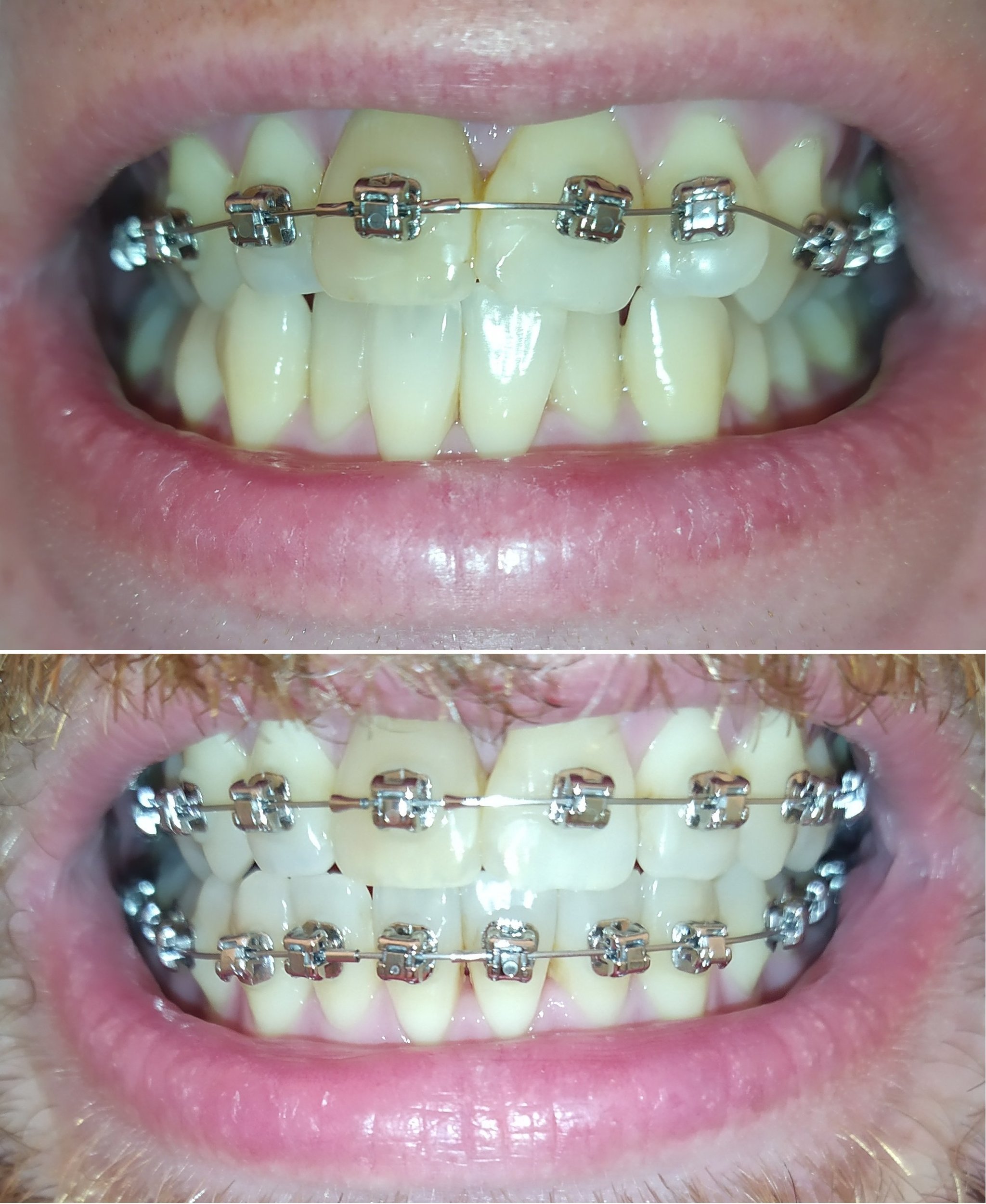 Каждая новая скоба толще и жестче предыдущей, потому после каждой установки неописуемые ощущения возвращаются на пару дней, но это терпимо. Исключение было, когда поставили скобу квадратного профиля на нижнюю челюсть - было прям как в первый раз. Нижнее фото это как раз незадолго до этого. Они на тот момент еще были в разнобой, а когда поставили скобу они выстроились прям в идеальную линию. Сами понимаете - это жестко.