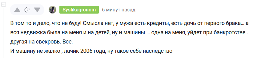 Та я уже там, спрашиваю про нотариальное дело :D Правда, мой коммент она не увидит. Мне в целом глупо похуй на истории тс, теперь меня интересует таки жив ее муж или действительно помер. Платить денег за проверку этой инфы я не хочу, да у меня и карты подходящей нет -_-