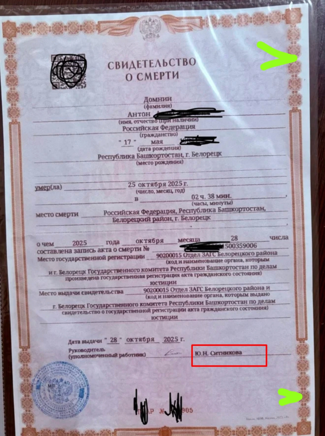 Обратите внимание в свидетельстве о смерти на подпись руководителя Ситникой Юлии Николаевны. Человеку 65 лет (родилась 1 июля 1960г) и раньше действительно работала заместителем начальника ЗАГСа Белорецка. ЭТА ЖЕНЩИНА ДОЛЖНА БЫЛА УЙТИ НА ПЕНСИЮ В 2022 ГОДУ. Госслужащим нельзя после 65 лет работать. Могли продлить до 2025 и то врядли. ТЕ максимум она могла работать до 1 июля 2025г.Данные госслужащих находятся в открытом доступе, если что! У нее есть странички в вк и одноклассниках, легко ее можно найти и ее дату рождения тоже. В настоящий момент начальник ЗАГСа - Хлынова Инна Сергеевна.
