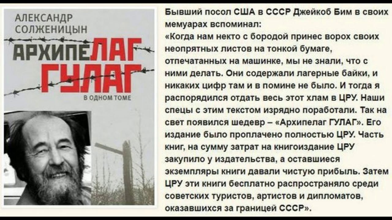 «Когда нам некто с бородой принес ворох своих неопрятных листов на тонкой бумаге, отпечатанных на машинке, мы не знали, что с ними делать. Они содержали лагерные байки, и никаких цифр там и в помине не было. И тогда я распорядился отдать весь этот хлам в ЦРУ. Наши спецы с этим текстом изрядно поработали. Так на свет появился шедевр - «Архипелаг ГУЛАГ». Его издание было проплачено полностью ЦРУ. Часть книг, на сумму затрат на книгоиздание ЦРУ закупило у издательства, а оставшиеся экземпляры книги давали чистую прибыль. Затем ЦРУ эти книги бесплатно распространяло среди советских туристов, артистов и дипломатов, оказавшихся за границей СССР».