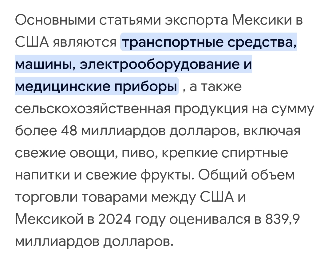 Мексика это сборочный цех для Китая и других производителей и она экспортирует в США огромное количество высокотехнологичных товаров.