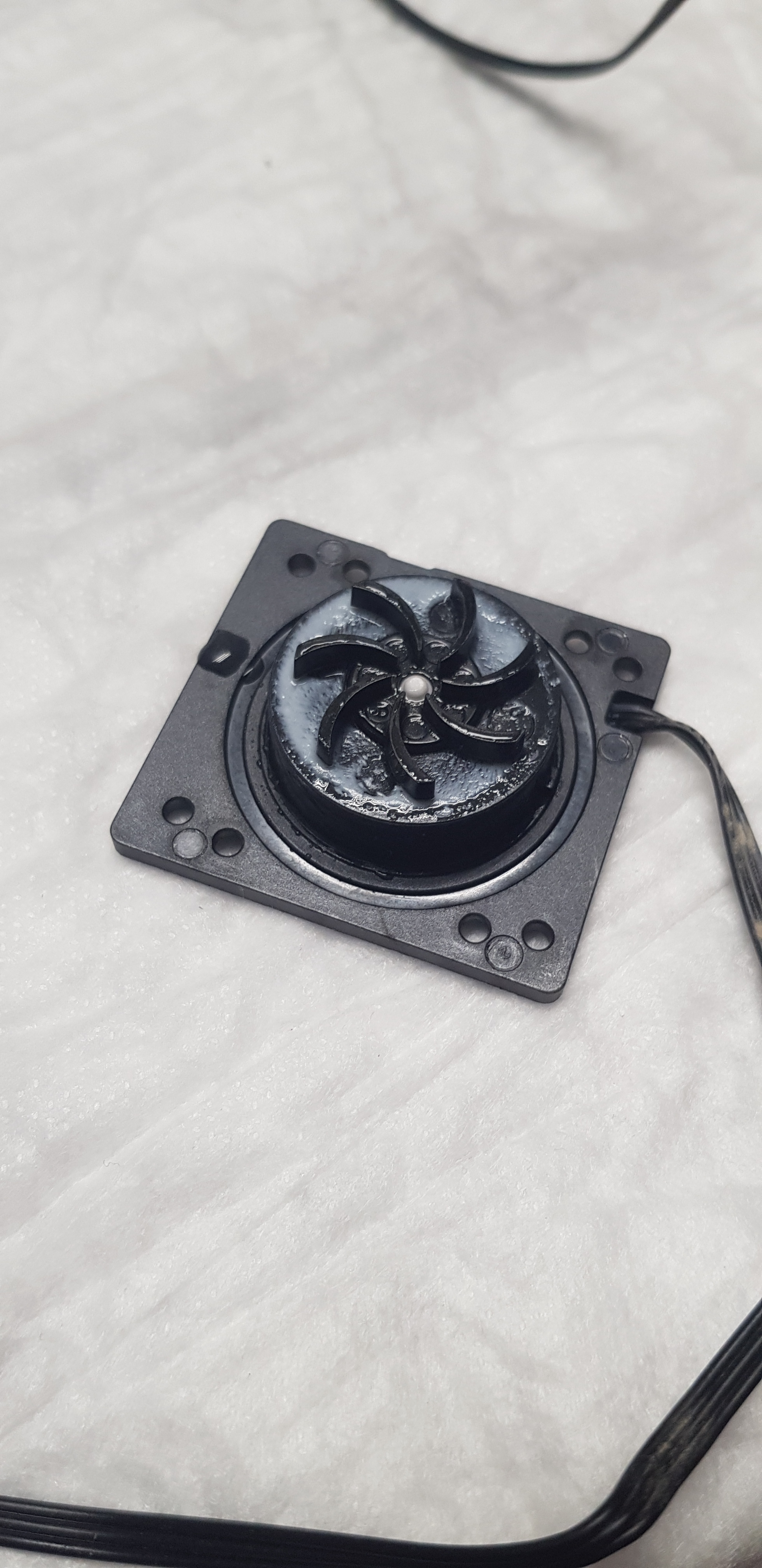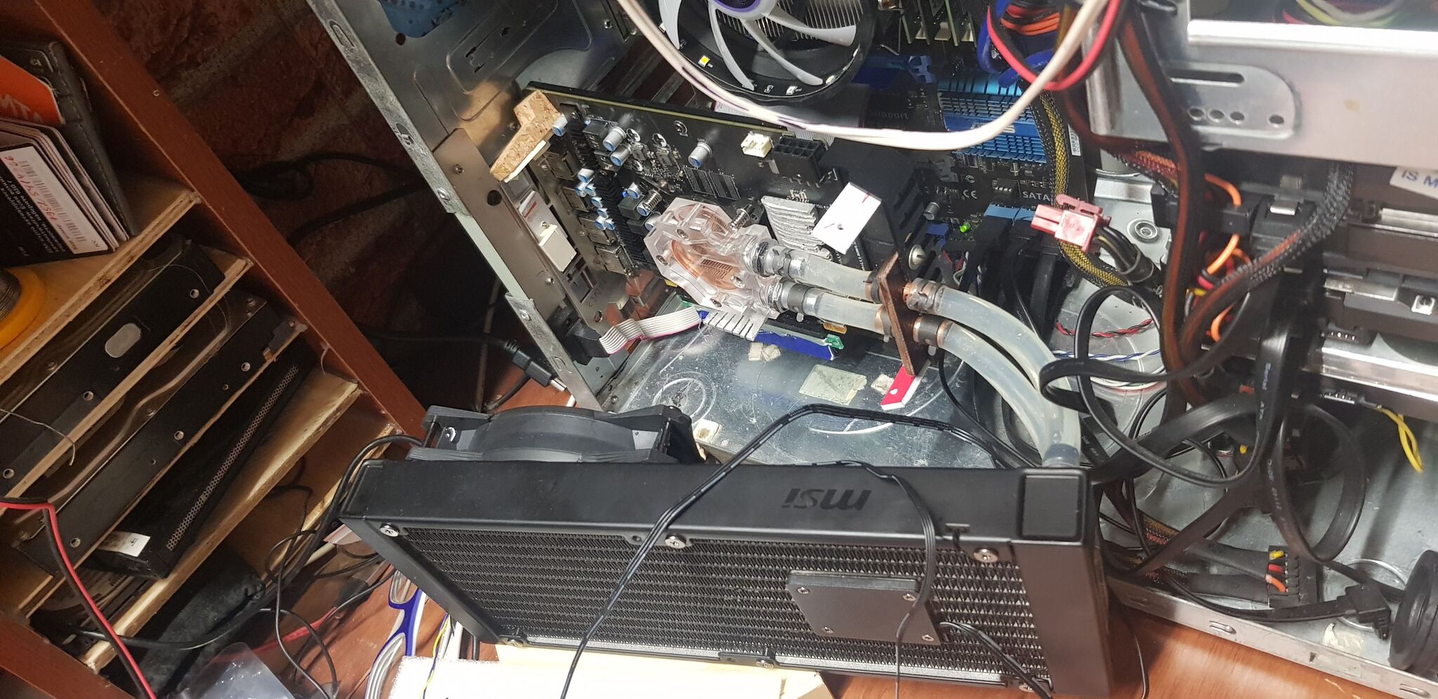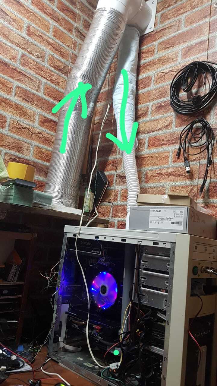 а я недавно снова решил побаловаться с водой, поддастало меня что с улицы 8градусов воздух к видюхи подходит а она греется 80..85 . хоть термопаста свежак да еще и термалгрызли за 800рублей с днса. раскопал свой старый коробку с теплообменниками да потом помпу искать стал. с алика для фонтанчиков чтото бесили и наткнулся на фирмовый комплект MSI с помпой в радиаторе. заинтересовал он меня . нашел в городе и купил. сильно дороже чем авитька но зато здесь и сейчас. А в эту тему пришел из поиска что добавить дистиллят . пробовал я уже ранее на древней видюхе даже с работы комплектный для МРТ ингибитор и биоцид. не понравилось. я тогда вообще стебал. 5л канистру на морозе в лед морозил, и водоциркуляцию через нее пускал чтоб отжаренный чип видюхи жил (ему энто не помогало дольше 2х недель) зато 2С темп видюхи под нагрузкой было забавно. щас сделал по культурнее. не на что не претендую так поделиться выкладываю, может на проц еще родной от системы теплообменник прилеплю но пока не придумал параллельно или последовательно его цеплять рентабельнее. и большой радиатор тоже толи над компом разместить толи сбоку как сейчас но в верхней части . вытяжка кстати 2 асиковых вентилятора , труба 120ая в стене обложенная минватой потолочной плиткой завернутой в мед пеленку тоже и 32й трубы по центру касается , за стеной короб 07 где-то на 2х140 в нем 2 вентилятора и всякие хаотичные перегородки из той же минватой потолочной плитки (с работы) ну и крыша из пластика. гудит все равно но не мешает разговаривать и тп. обычно шим провод с вентиляторов приложен к корпусу компа (минимальные обороты им задает) а когда попаять надо отцепляю от корпуса - выходят на номинал). да видюха не в соплях - парафин косметический это . чтоб он затял те места которые может в случае чего вода занять. поизвращавшись с теплаком понял что память греется и приклеил на нее самодельноизображенные радиаторы капли супер клея по углам а всерединку g900, большой радик это болванка из бп атх и болгаркой нарезал "ламелей" на городулях родные вентиляторы. и вообще все у нее там стало хорошо с температурой.