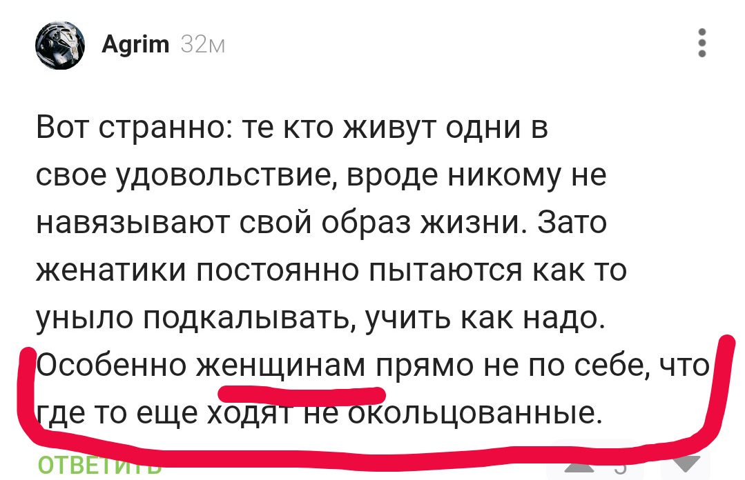 Ничего не имею против отношений. Ни в коем случае не топлю за чайлдфри и т.д. Кто как хочет, так и живет. Но вопрос то был зачем делать аж отдельный пост в явно в уничижительной форме, вообще не по теме оригинального поста. Можно было бы оставить комментарий в оригинальном. посте. С одной стороны говорите, то все равно, с другой засоряете ленту как эти "мальчики" бессмысленными злобными постами. Про баянистость я молчу, это на пикабу уже давно никого не волнует.