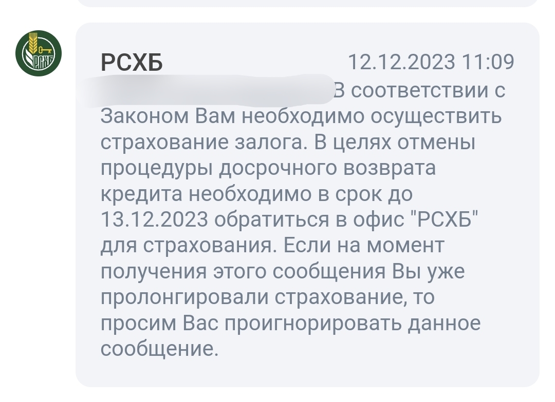 .. меня страховка закончилась. Банк уже раза три грозно грозил разорвать ипотеку и заставить погасить её. Но не разрывает (смайл). Потому что прекрасно знает, что я могу погасить её досрочно в любой момент. И тогда банк потеряет мои ежемесячные платежи. Поэтому банк продолжает пытаться нахаляву ещё и страховку срубить, но ипотеку оставляет.