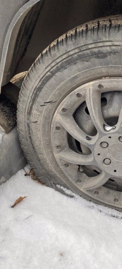 Прошло несколько месяцев, наступил ноябрь. Выпал первый снег. Выхожу с утра на работу, иду к машине, вижу, что колесо спущено. Думаю, ну старая машина, эх. Подхожу ближе и вижу, что спущено и второе колесо. А в шинах дыры. Обхожу машину по кругу - спущены все 4 колеса. Вызываю 112.