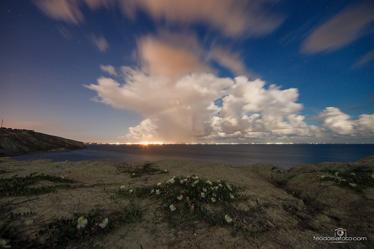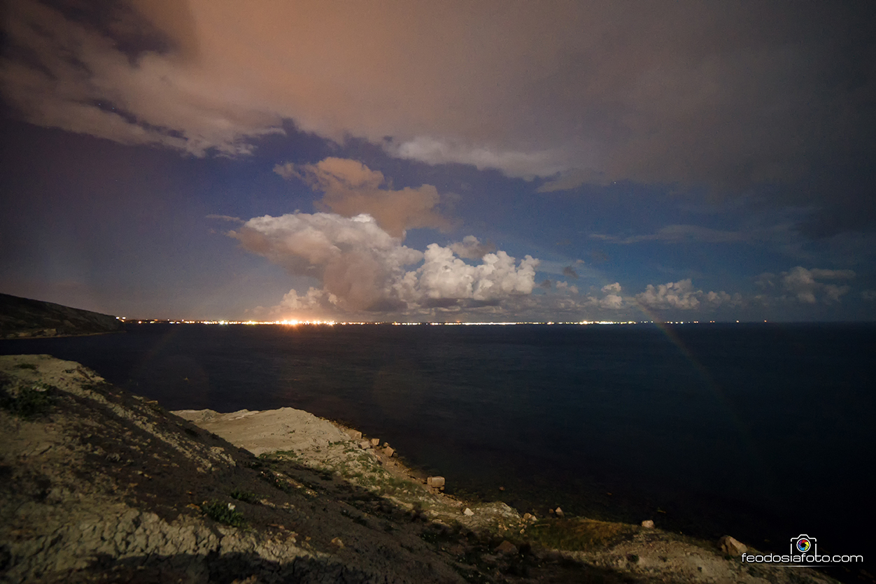 В эту ночь было полнолуние и очень прозрачный воздух из за ливня, то есть Луна очень ярко светила и ее свет на пару с ливневой тучкой дали полноценную радугу. Видел такое только раз в жизни.
