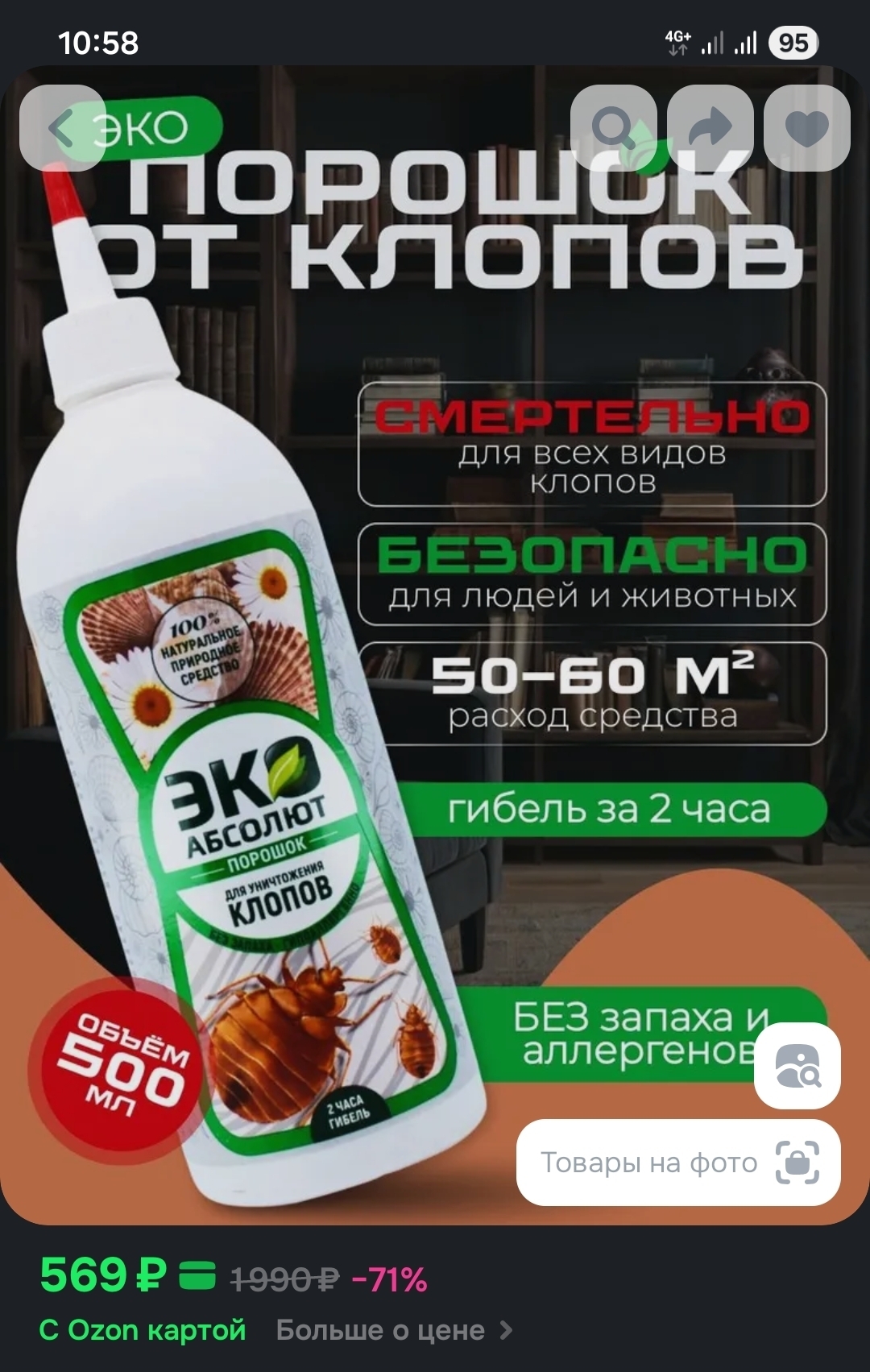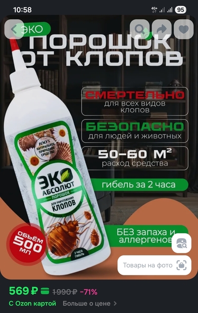 Отличное средство от клопов. В составе растёртые ракушки, которые при попадании на насекомое его обезвоживают. Я сам долго, нудно и дорого воевал с клопами, которых завезли соседи-алкаши. Никакие химикаты и химчистки не помогают. Заказал пару бутылок этой херни на озоне, напшикал везде и через пару суток ниодной твари не осталось. Для людей и домашних животных безвреден, только вызывает небольшой дискомфорт при попадании в нос. Стоит копейки. Пользуйтесь. НЕ РЕКЛАМА ПЛЯТЬ!