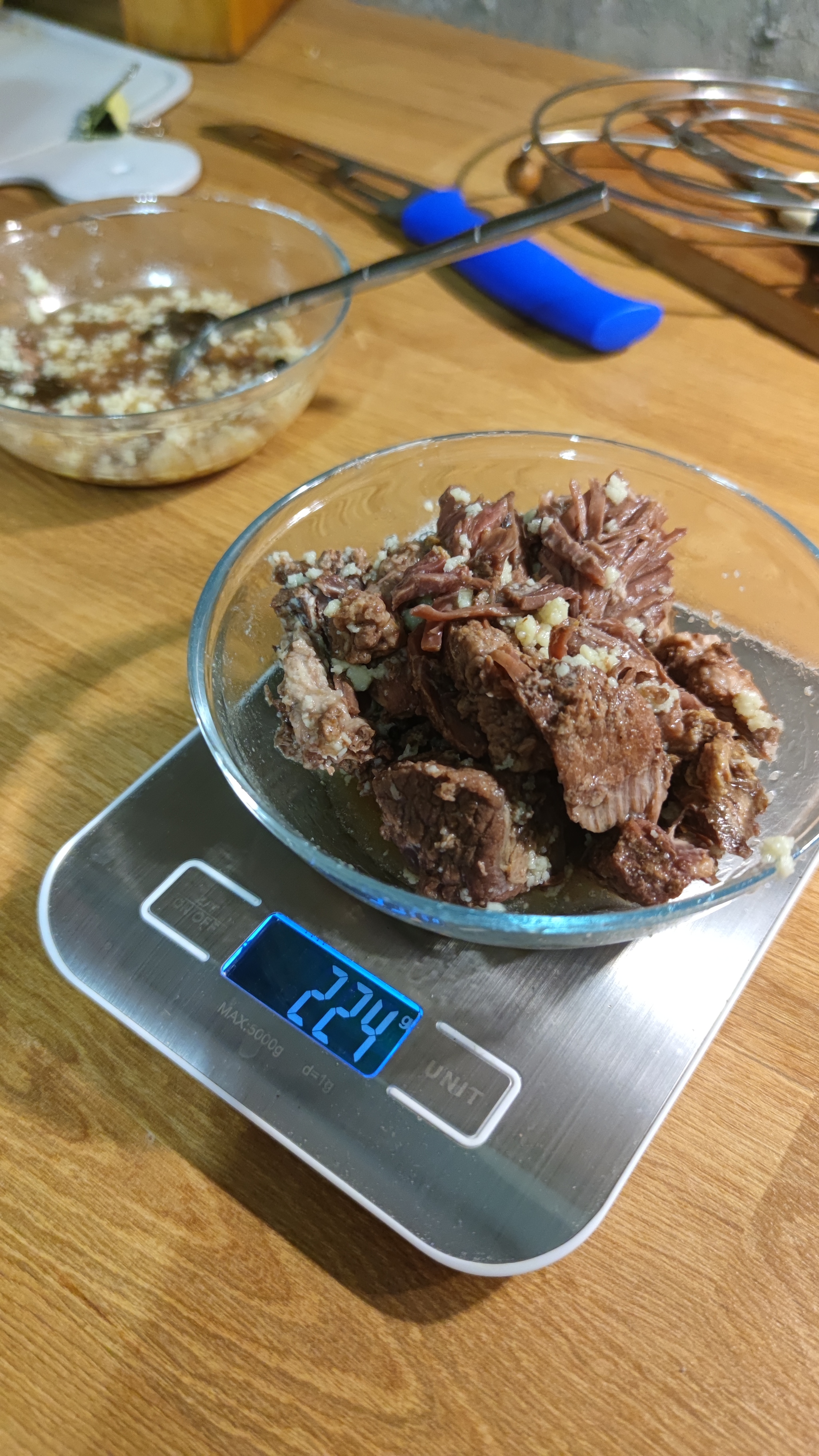 И уже на этом этапе можно оценить, что мясо большими кусками, хорошо отделяются волокна. Жил не видно вообще, заметили один маленький кусок какой-то соединительной ткани, но он легко разорвался. Опять же по внешнему виду жира - видно, что он чисто говяжий, без примесей, легко крошится.