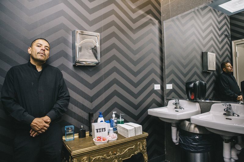 Должность называется Restroom attendant термин внесён в Оксфордский словарь. История возникновения данной должности банальна, люди убирали туалеты в отелях/клубах/ресторанах и решили подзаработать купили всякой нужной штуки( мятные конфеты, презервативы и средства гигиены) и продавали во время смены.