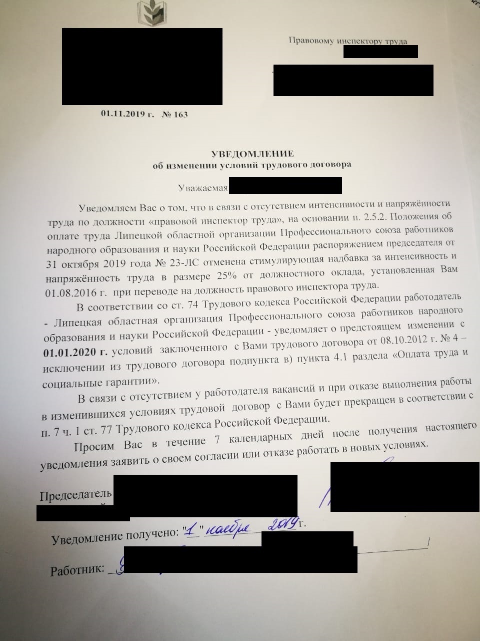 Спустя ,наверное, 1 неделю написания отчётов жене выдали уведомление о том, что 1 января 2020 года (за 2 месяца по закону) , у нее вносятся изменения в трудовой договор, связанные со снятием доплаты за интенсивность и напряженность.