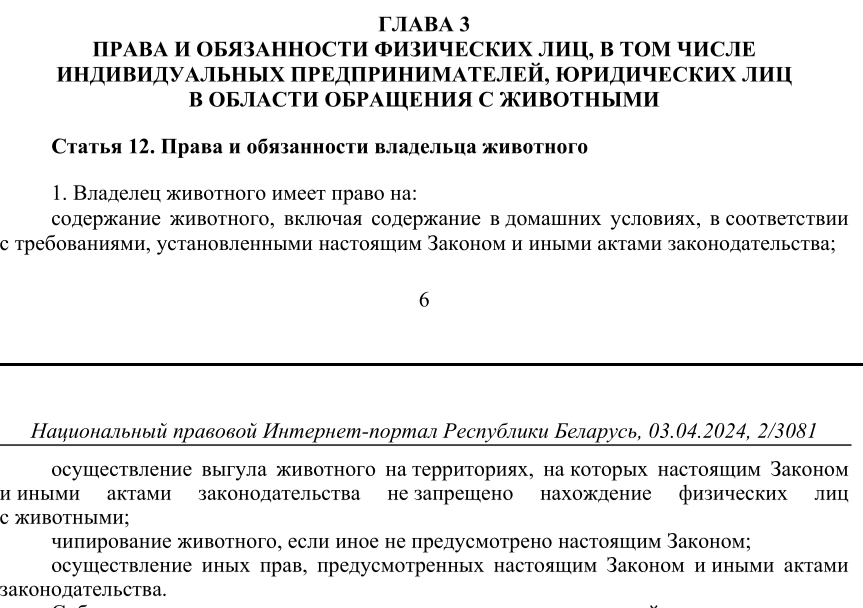 В Беларуси в апреле этого года введён закон о регулировании содержания животных-компаньонов (читай домашних животных), сейчас всё на стадии оформления в удобоваримые регламенты местными органами управления но суть примерно такая: