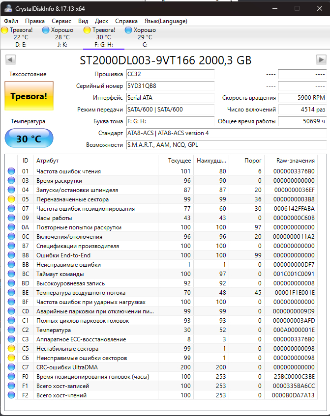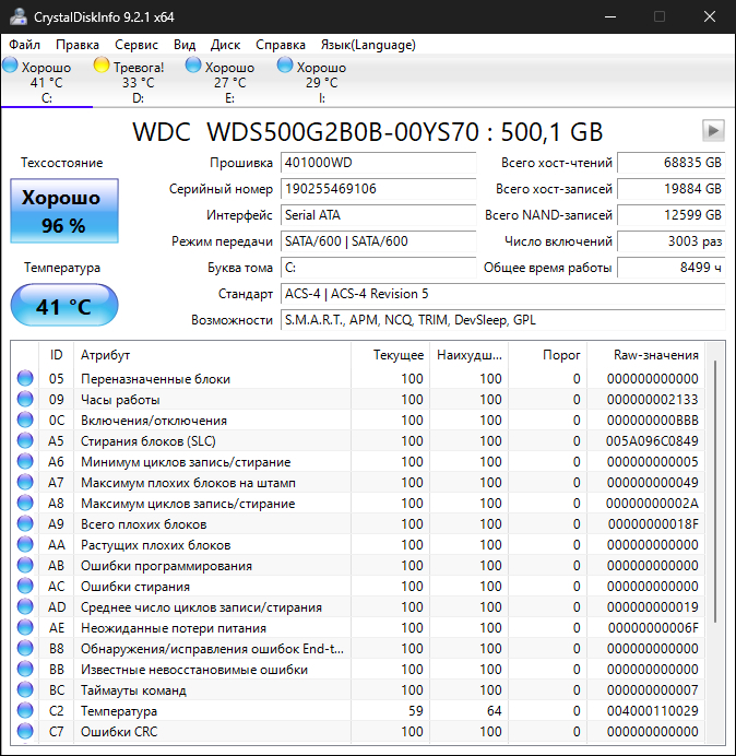 Общее число включений/время работы/хост-записи/хост-чтения.