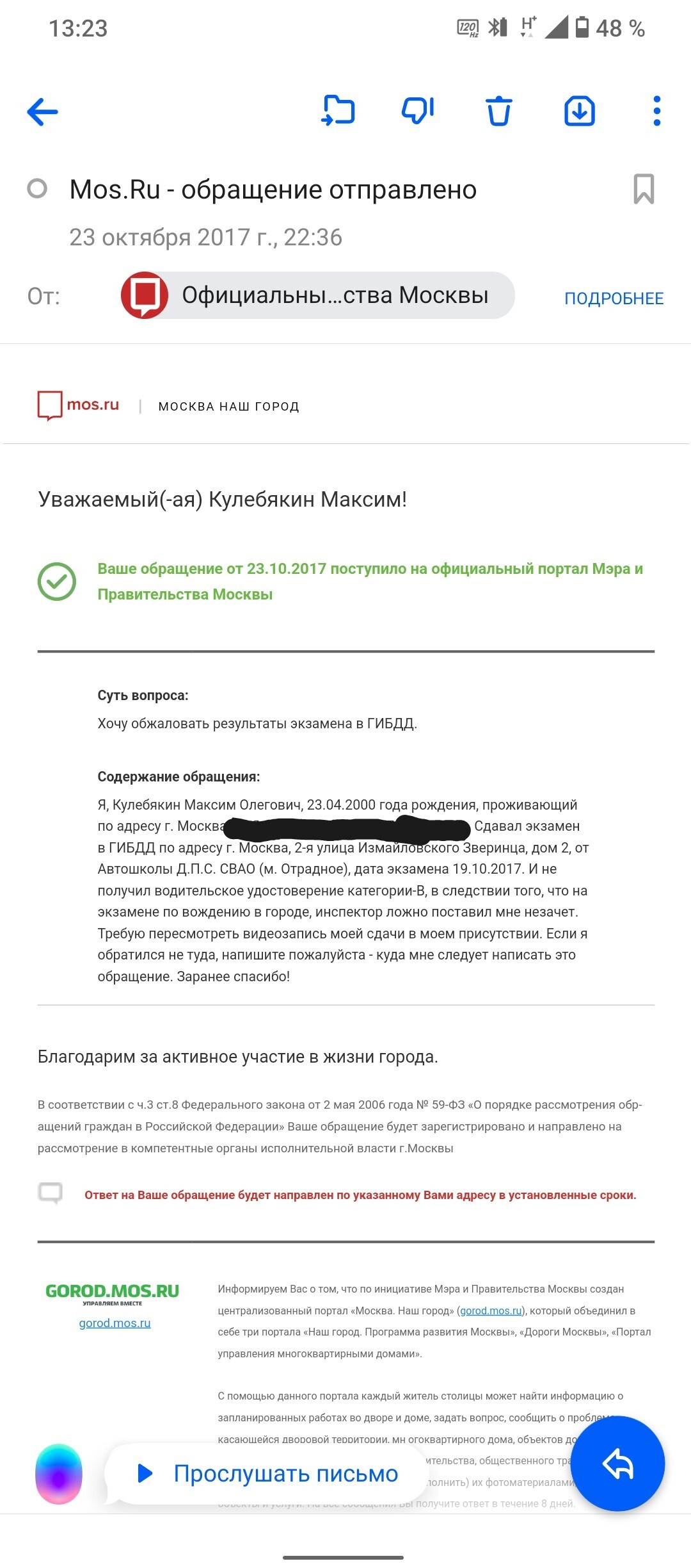 Я не был на 100% уверен в том, что я прав, но решил с этим разобраться, благо когда я сдавал, экзамен записывали 3 камеры в машине, и все они прекрасно работали, инспектор обращал на это внимание перед началом экзамена. Поэтому я подал апелляцию через ПГУ.мос.ру