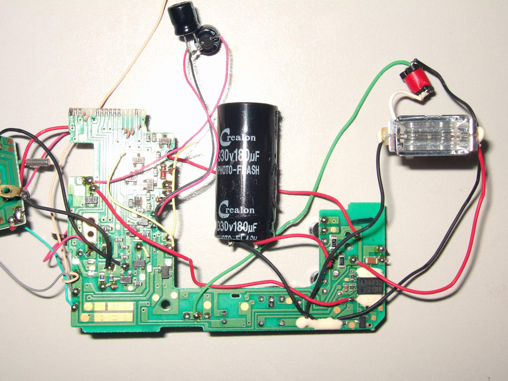2. Наверное все смотрели хоть один из фильмов Люди в чёрном. И все хотели себе шикарный нейролизатор, стирать память маме о косяках, и прочее прочее. Ну а что представляет из себя этот чудо прибор? Вспышку от фотоаппарата, очевидно же. Было принято решение разобрать один сломанный фотик, чтобы отделить вспышку. Но сначала проверка, да? Ищем батарейки, ждём 3 секунды и наслаждаемся яркой вспышкой в глаз. Щикарно! Вынимаем питание, и снимаем переднюю крышку, ведь винты уже давно выкручены. Так, вот лампа, вот кнопка, вот.. ого, какой большой конденсатор, на 600 вольт!