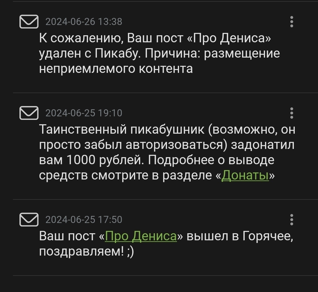 В общем, 25.06 опубликовал пост про своего бывшего коллегу, который лишился ноги. Под автобус попал. Очень много у него было проблем, в том числе материальных. Но суть была в том, что просил я любую помощь. Оставил своё мыло. Люди откликнулись, я их потом в других постах благодарил. Не только донаты были, человек из его города подвезти его до больницы предлагал, фонды разные рекомендовали. Пост снесли через сутки.