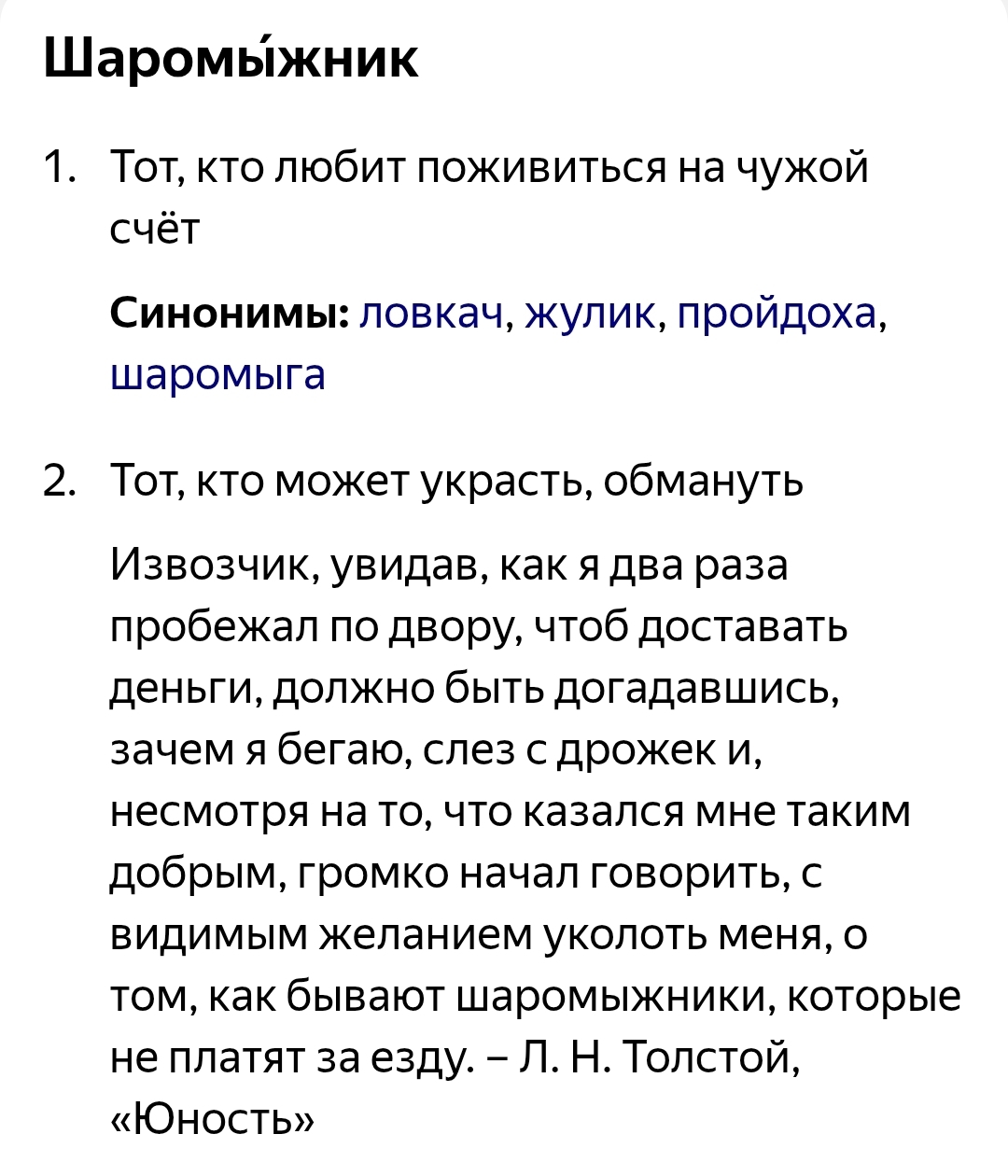 Согласно многим воспоминаниям, бывшие бравые солдаты французской армии в 1812 году подходили к русским и уже не требовали, а просили какого-нибудь пропитания, обращаясь к ним сher ami (шароми) – «милый друг». Крестьяне в импортных языках были не очень сильны и по звучанию называли их «шаромыжниками». Правда, в этом не последнюю роль сыграли, видимо, и русские слова «шарить» и «мыкать».