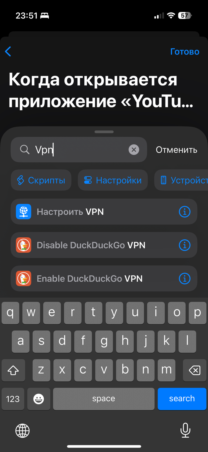 Заходим в приложение «Команды», внизу переключаем на вкладку «Автоматизация». Добавляем новую автоматизацию, нажав плюсик. Выбираем пункт «Приложение» и «Открыто», указываем список интересующих приложений, далее настраиваем новую автоматизацию, вбив в строке «VPN» - там указываем нужное подключение. Аналогично настраиваем отключение VPN при выходе из приложения, добавив ещё одну автоматизацию.