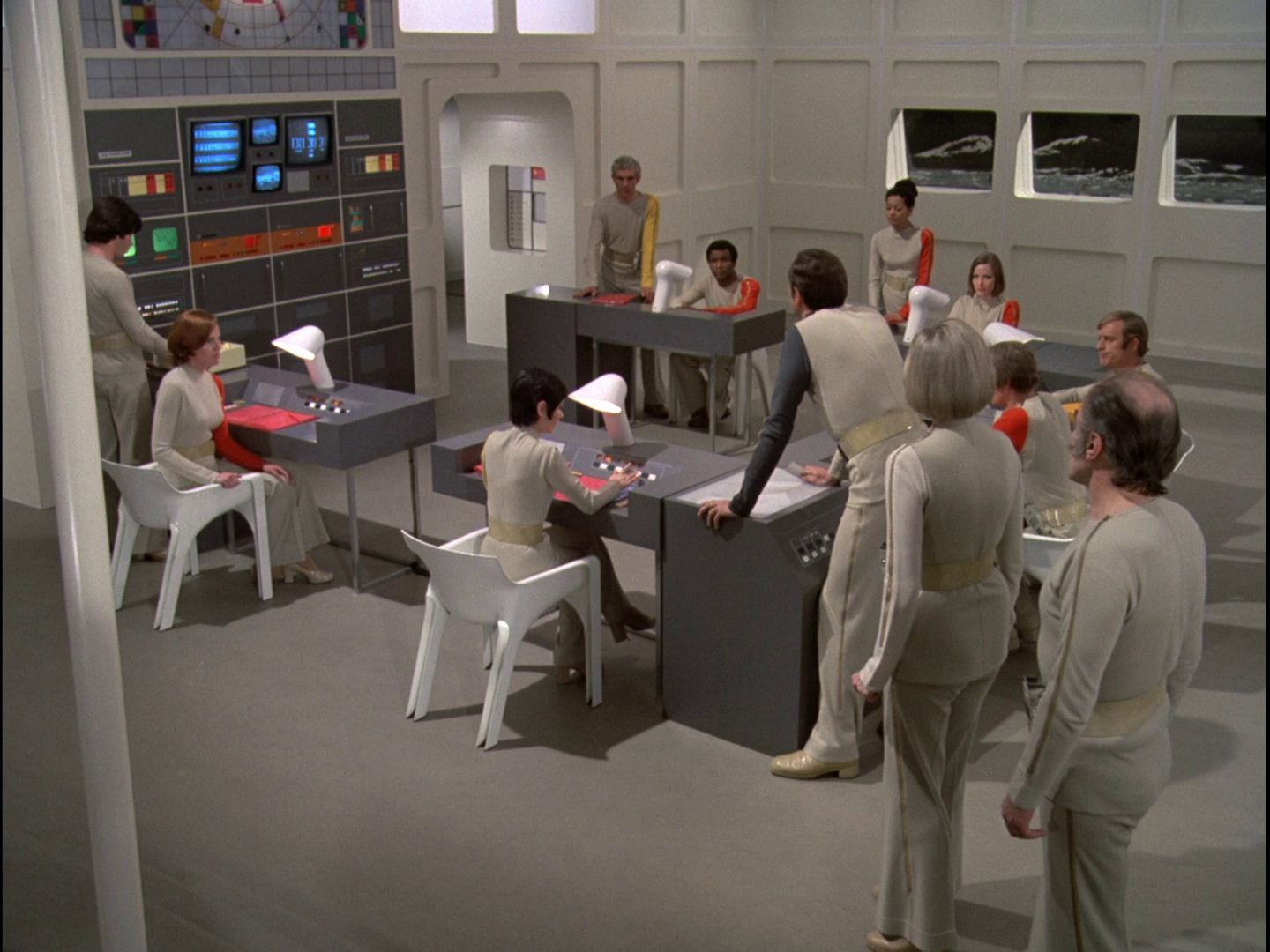 А также общая обстановка, характерная моде 70х (по сюжету у нас конец 20 века, но все, включая мужчин, ходят в брюках клёш и на невысоких, но каблуках (что при тряске корабля могло вызвать переломы всех ног, но зато "красиво")). Часть реквизита явно было взято со съёмок Стар Трека, особенно монстров, которых точно "слепили из того, что было"