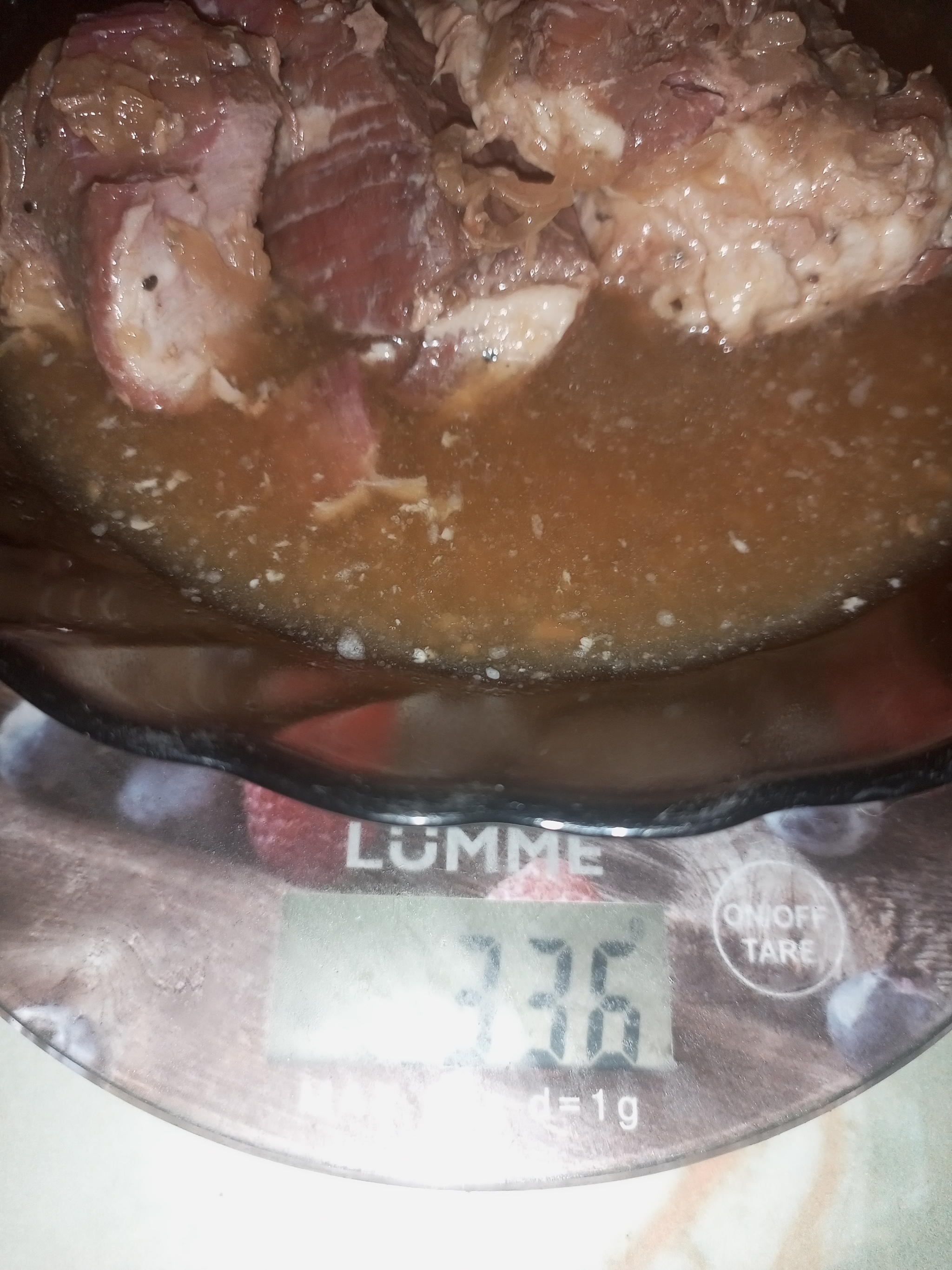 135 г жидкости. 199 г мяса. Два грама таинственно испарились при переливании.