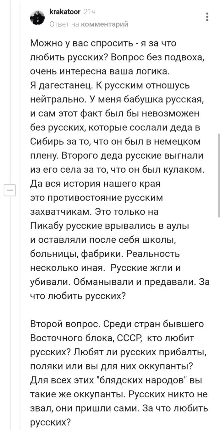 Я специально ждал пока у некоторых остынет пятая точка от того факта, что кто-то не считает деяния русских в истории Кавказа правильными. Ждал, что может люди, у которых есть время лазить по моим старым постам и комментариям, и минусовать их, загонят мой аккаунт в автоматический блок, чтобы навсегда покинуть сайт превратившийся из развлекательного в филиал одноклассников с "лидерами мнений" и стадным инстинктом. Но так как этого не случилось, отвечаю. Вернее, т.к. я не историк, за меня ответят историки.