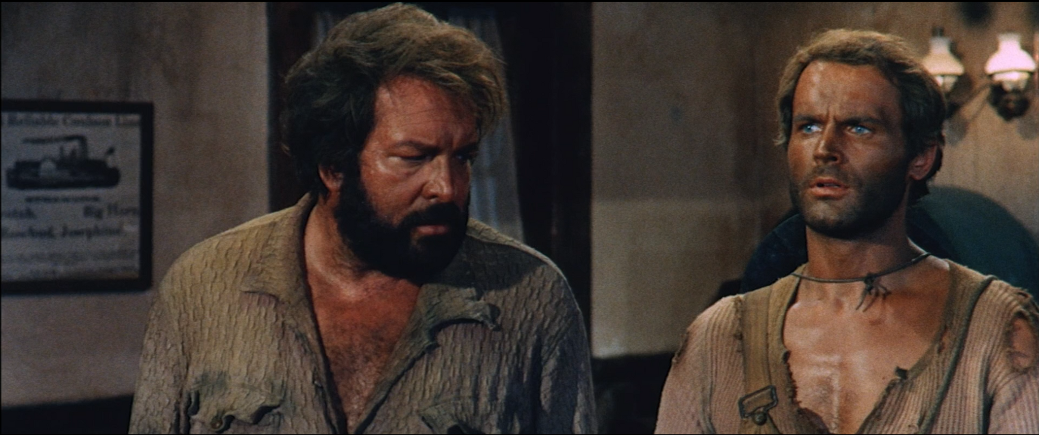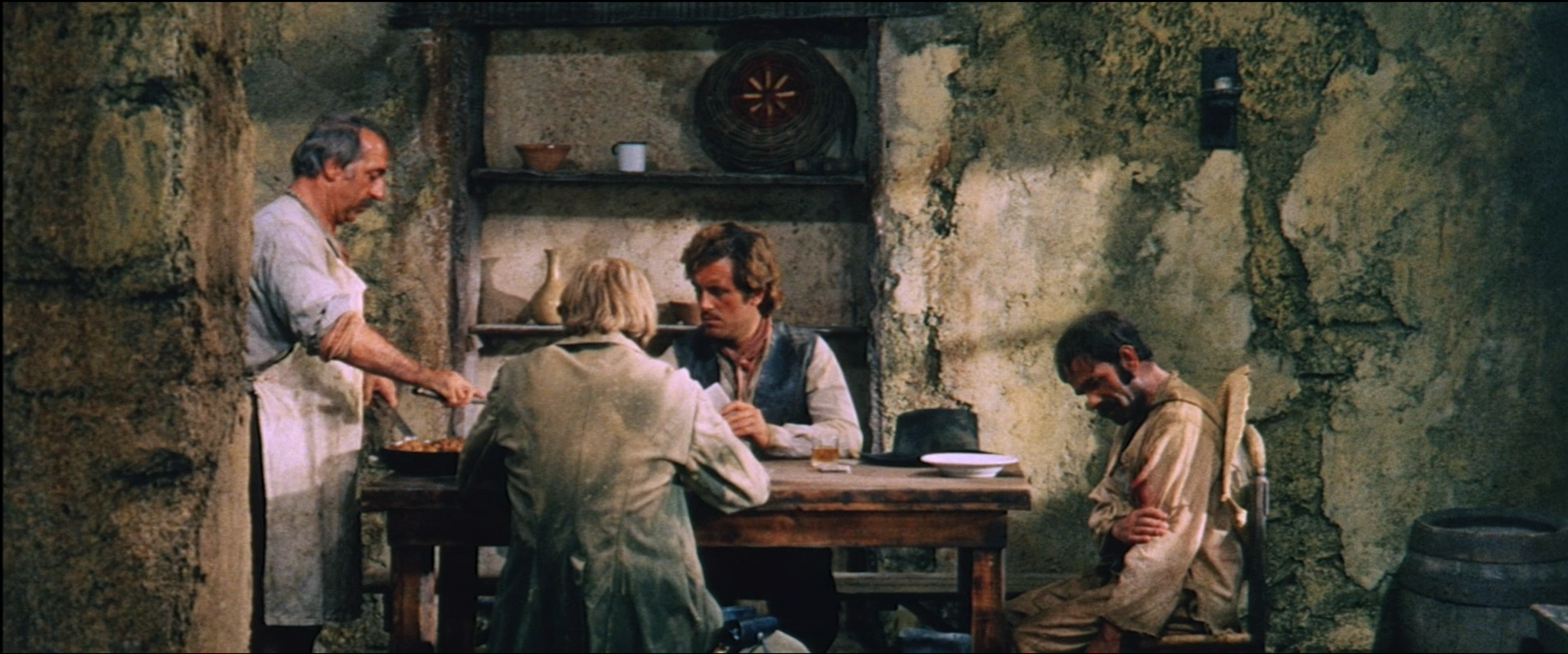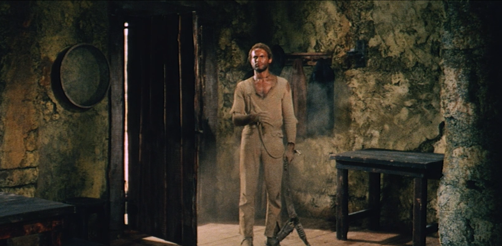 Тут же, ГГ в начале фильма заходит в таверну и выбивает из себя тонну дорожной пыли. Думаете дальше он найдёт нормальный прикид, в котором будет щеголять оставшийся фильм? Нет, он так и будет в этом драном шмотье.