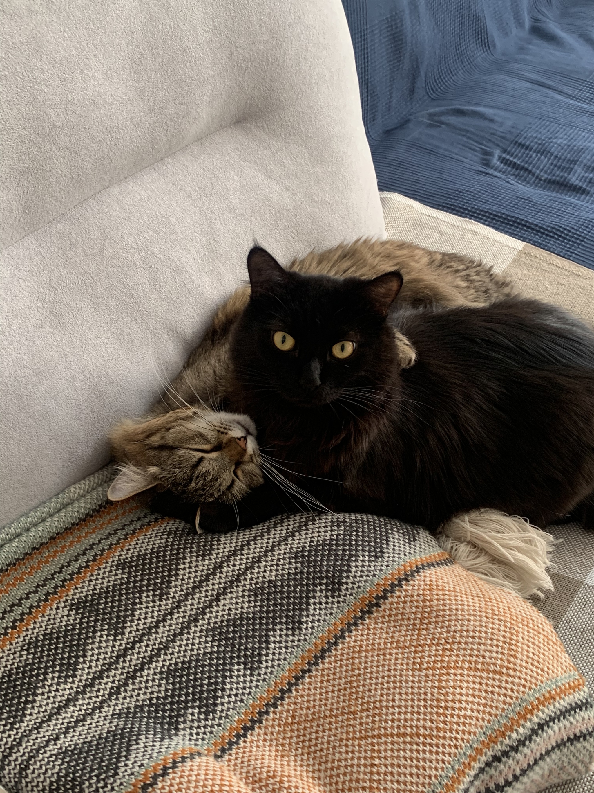 Забрали их из котокафе, планировали одного, но они, как выяснилось, лучшие друзья и решили забрать обоих сразу в один дом)