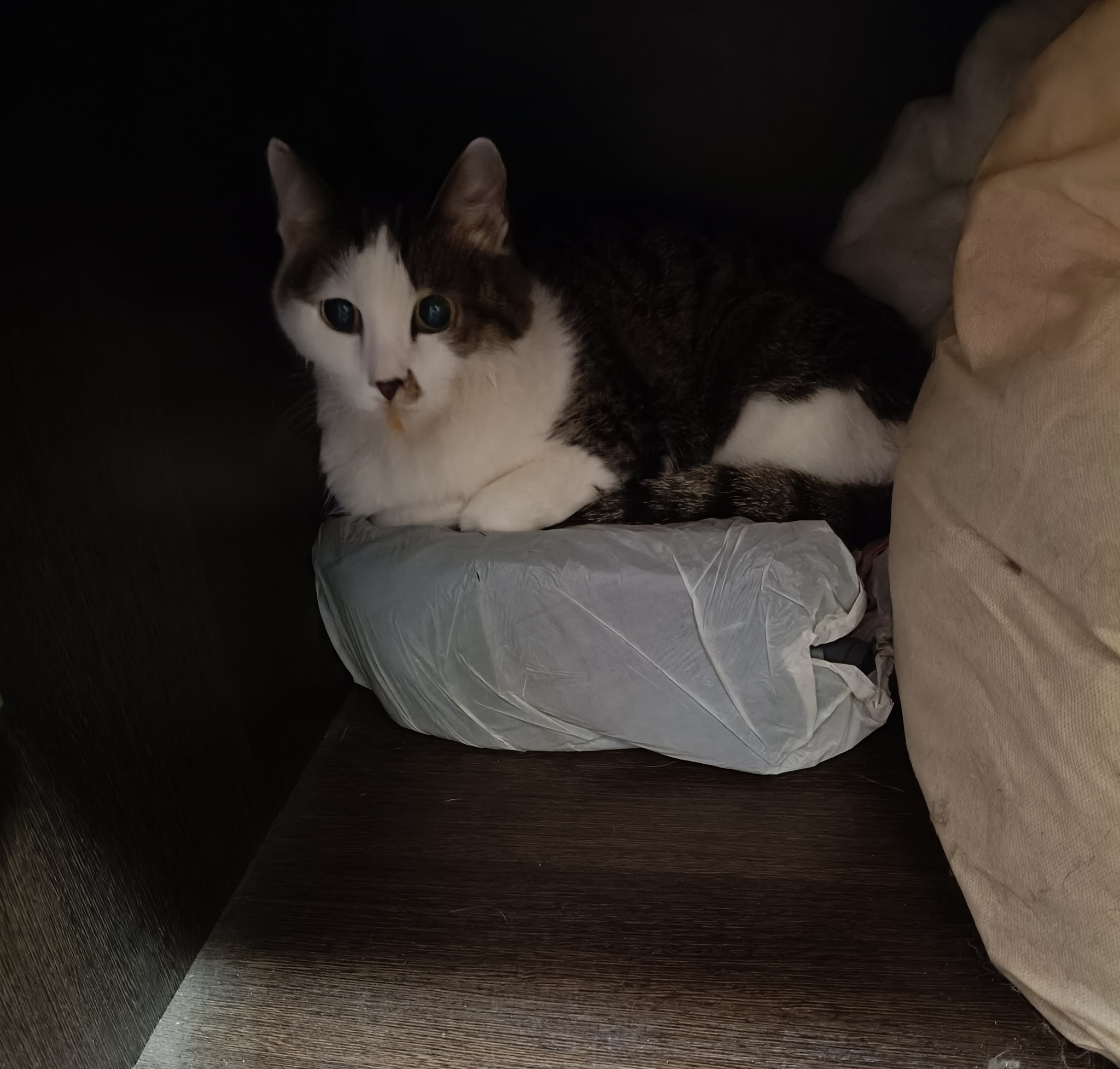 Не думала, что за эту коробку возможно было пробраться, но Боня как-то просочилась.