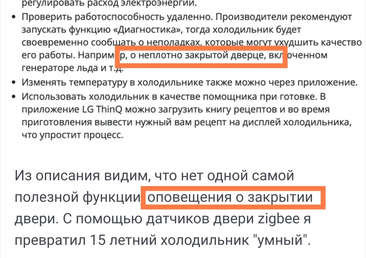 Из описания видим, что нет одной самой полезной функции, оповещения о закрытии двери. С помощью датчиков двери zigbee я превратил 15 летний холодильник "умный".
