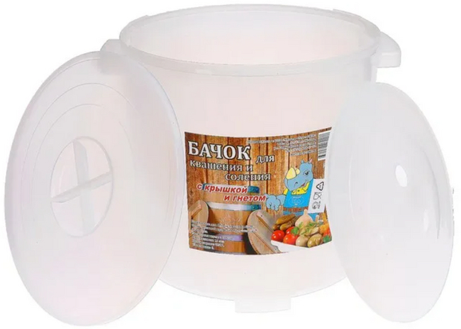 Стоит всего-ничего, 13 литров, крышка, кружок для гнёта, в общем то, что нужно (у меня два подобных, если что). И не обязательно делать под завязку, сколько хочешь, столько и закладываешь.