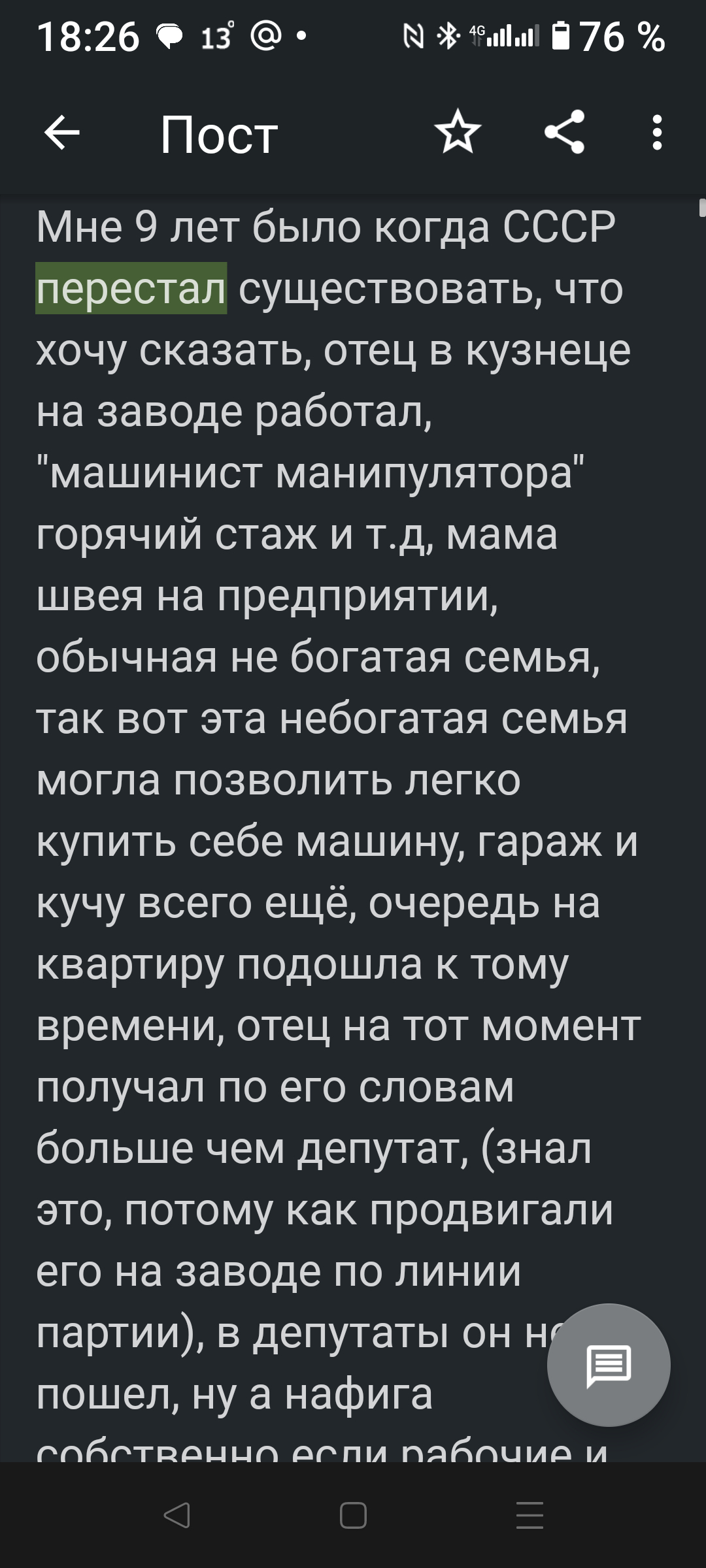 Мне 9 лет было когда СССР перестал существовать, что хочу сказать, отец в кузнеце на заводе работал, "машинист манипулятора" горячий стаж и т.д, мама швея на предприятии, обычная не богатая семья, так вот эта небогатая семья могла позволить легко купить себе машину, гараж и кучу всего ещё, очередь на квартиру подошла к тому времени, отец на тот момент получал по его словам больше чем депутат, (знал это, потому как продвигали его на заводе по линии партии), в депутаты он не пошел, ну а нафига собственно если рабочие и так жили лучше них, а потом паскуды вроде Чубайса, деноминация и т.д и т.п, все отложенные деньги лежали в Сбербанке, как же я их ненавижу, так вот, на деньги которые он снял тогда купил палку колбасы и бутылку водки, больше ни на что не хватило, завод разом стали банкротить, долги по зарплате по полгода и т.д,. Дальше жить стало очень трудно, помню как отец с матерью рассказывали, "вышли в магазин" мать идёт плачет, денег на батон хлеба нет, чем кормить двух детей непонятно.