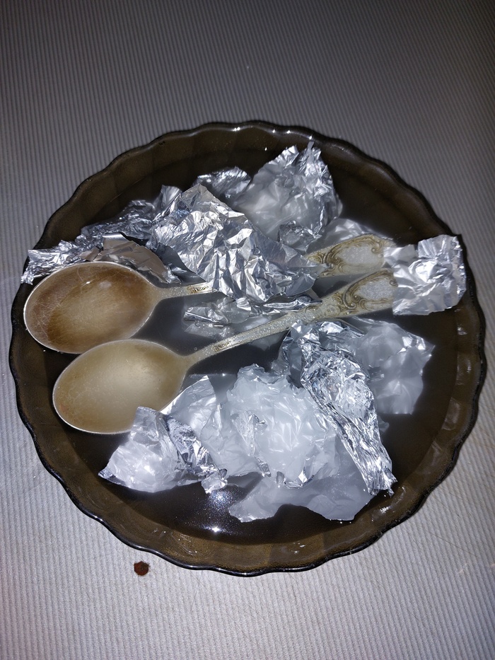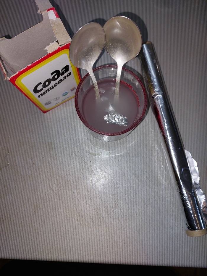 В любую ёмкость помещаете ложки-вилки, туда же кусочками нарвать фольги и посыпать содой, несколько столовых ложек. И туда же налить кипятка.