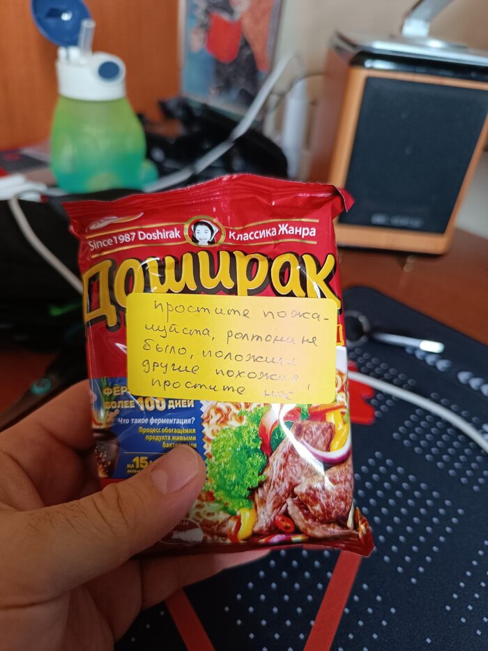 А мне сегодня очень даже повезло с доставкой из 5-ки. Закинула в корзину лапшу, чтобы добить сумму до бесплатной доставки. Приехало вот это)))) Да еще и Биг ланч сверху положили. Видимо в качестве дополнительных извинений))) Как же надо было людей запугать, чтобы они вот за такую маленькую замену Ролтона на Доширак так переживали.
