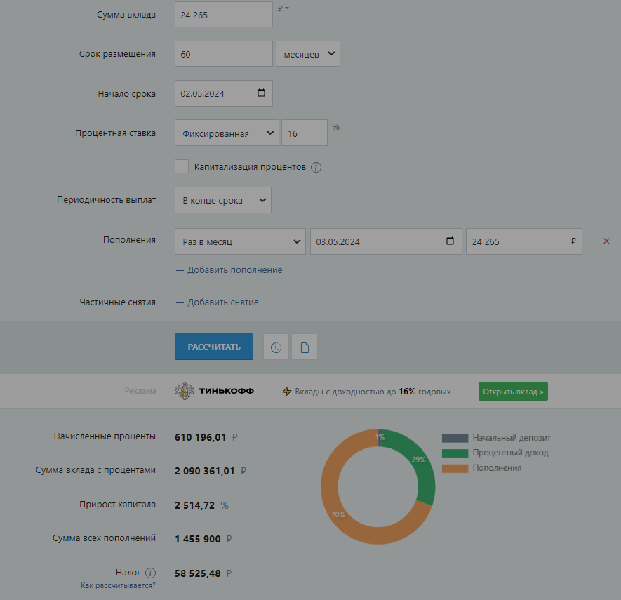 Я вот решил с калькулятором прикинуть. Взял реальные 8% льготной ипотеки с сайта Сбербанка на 10 лет, цену квартиры поставил за 2 миллиона (справедливая и реальная цена, плюс удобно считать) и отдельно посчитал 5 лет депозита под 16% с сайта Сбербанка на сумму ипотечного платежа. Почему 5 лет - потому что если бы мы вносили эту сумму в досрочное погашение, ипотека сократилась бы минимум вдвое.