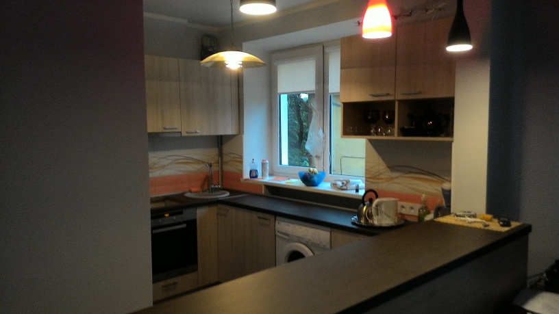 Плиты еще нет. Ламинат 2 видов. Коридор, проход на кухню и кухня - темный. Прочее - светлый. Разделены люминдиевой полосой. Тут электричество тут не доделано до конца. Менялось все на ходу.