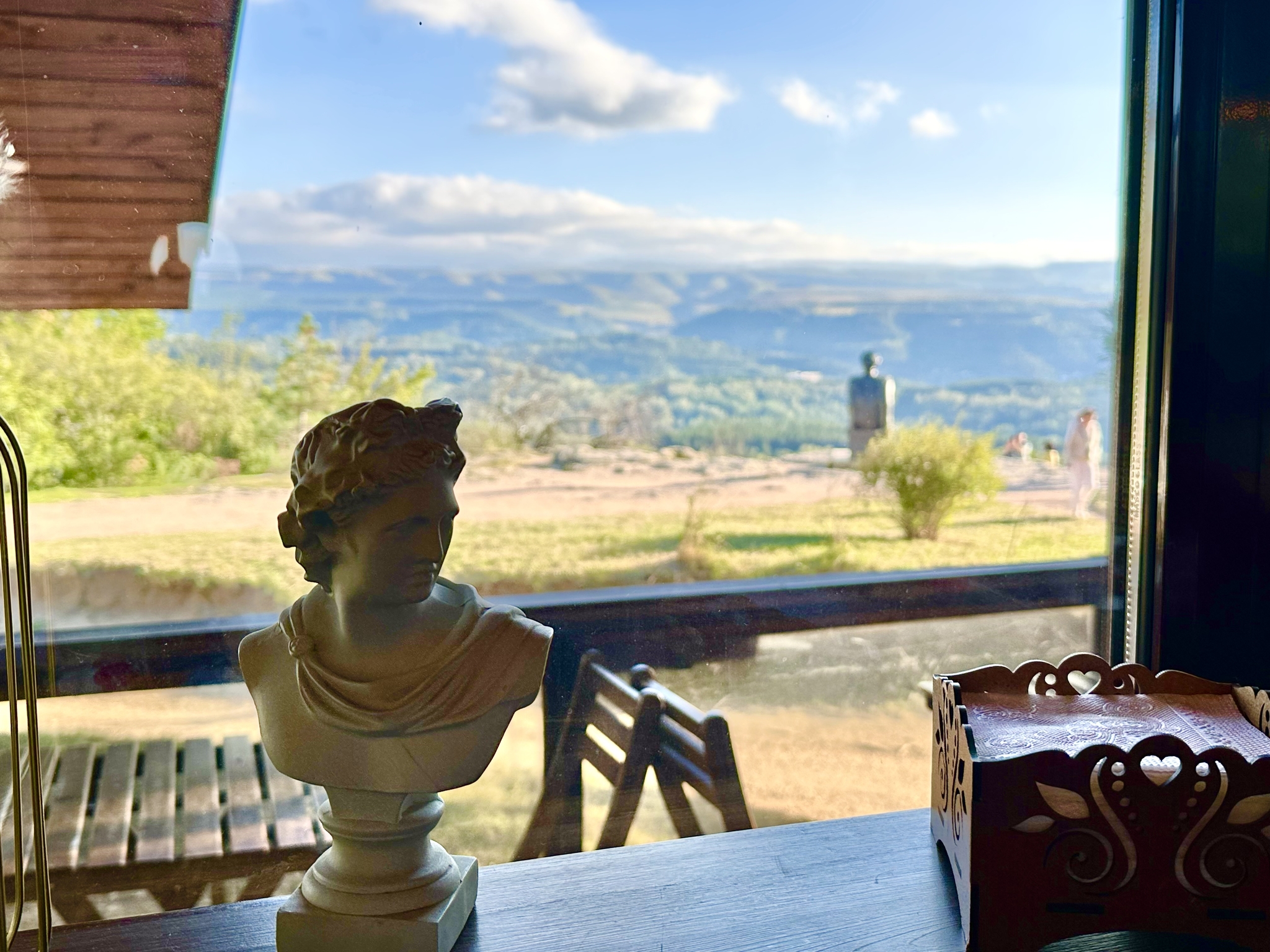 Бюстик римлянина пытается рассмотреть, как статуя Лермонтова вглядывается в горизонт. Где-то там - Эльбрус, но он укрылся облаками