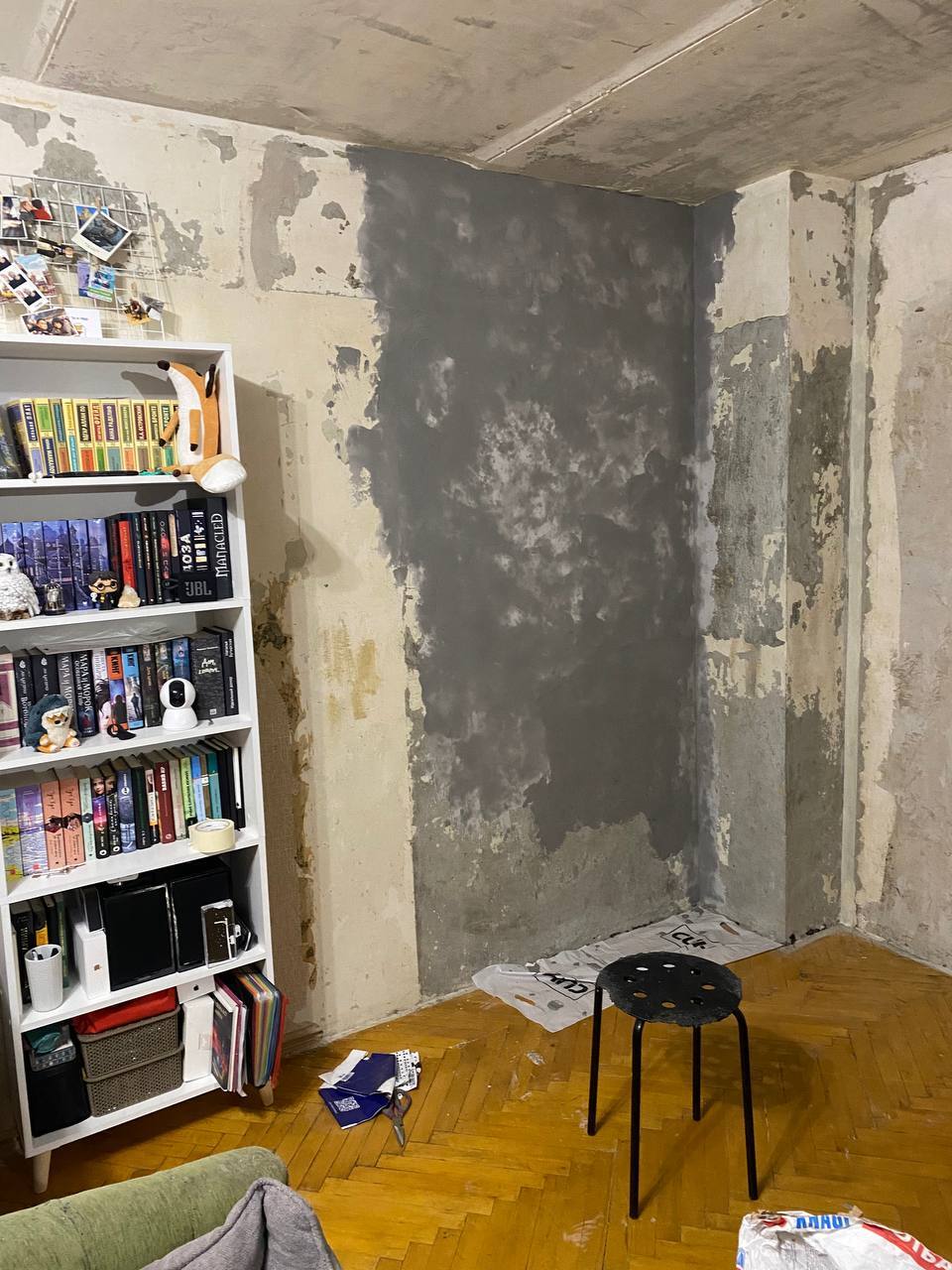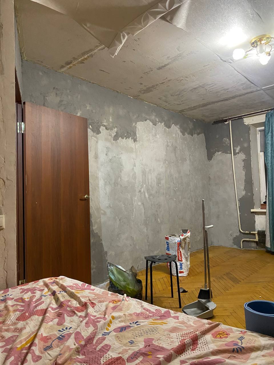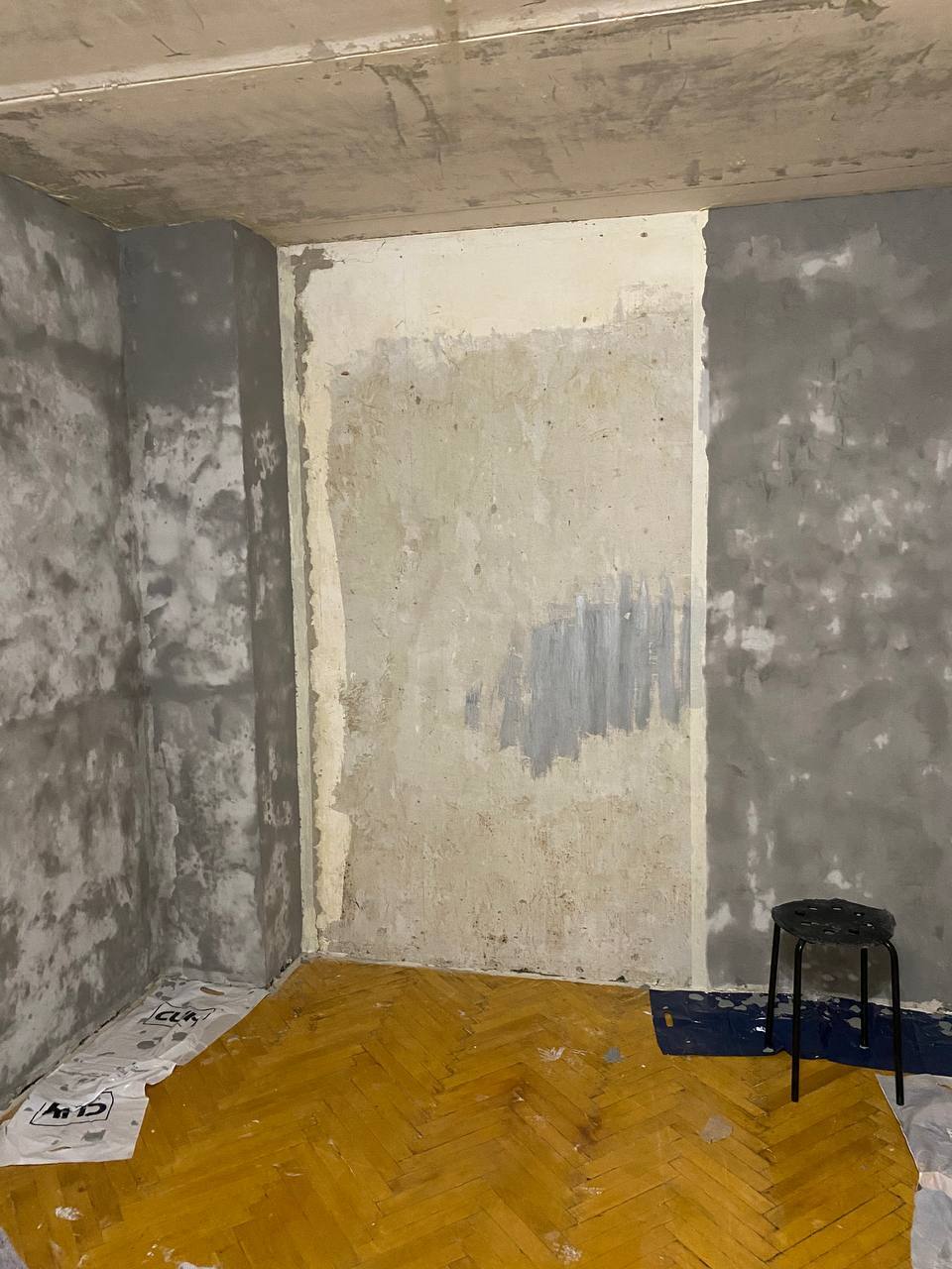 В какой-то момент все вещи переехали в коробки, мы разобрали шкаф и заштукатурили последний кусок стен, так что впереди был следующий этап - полы