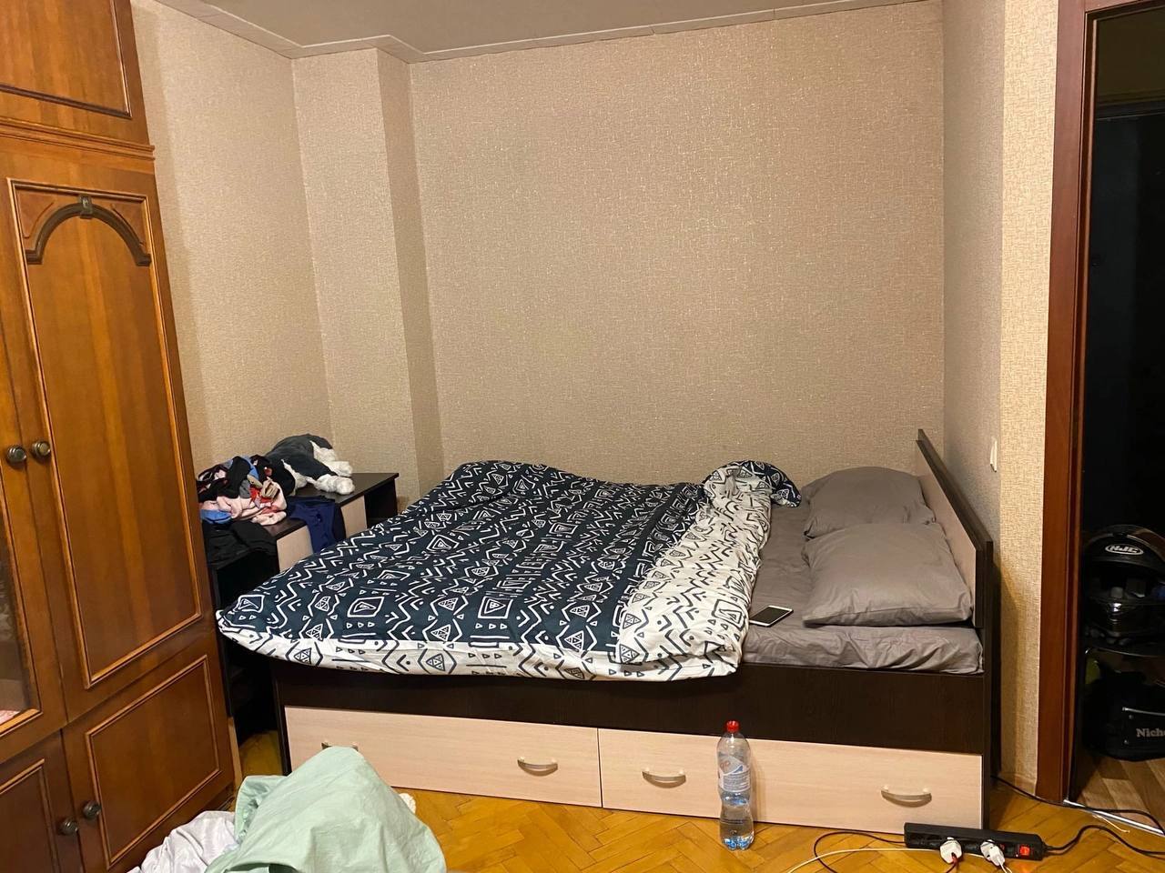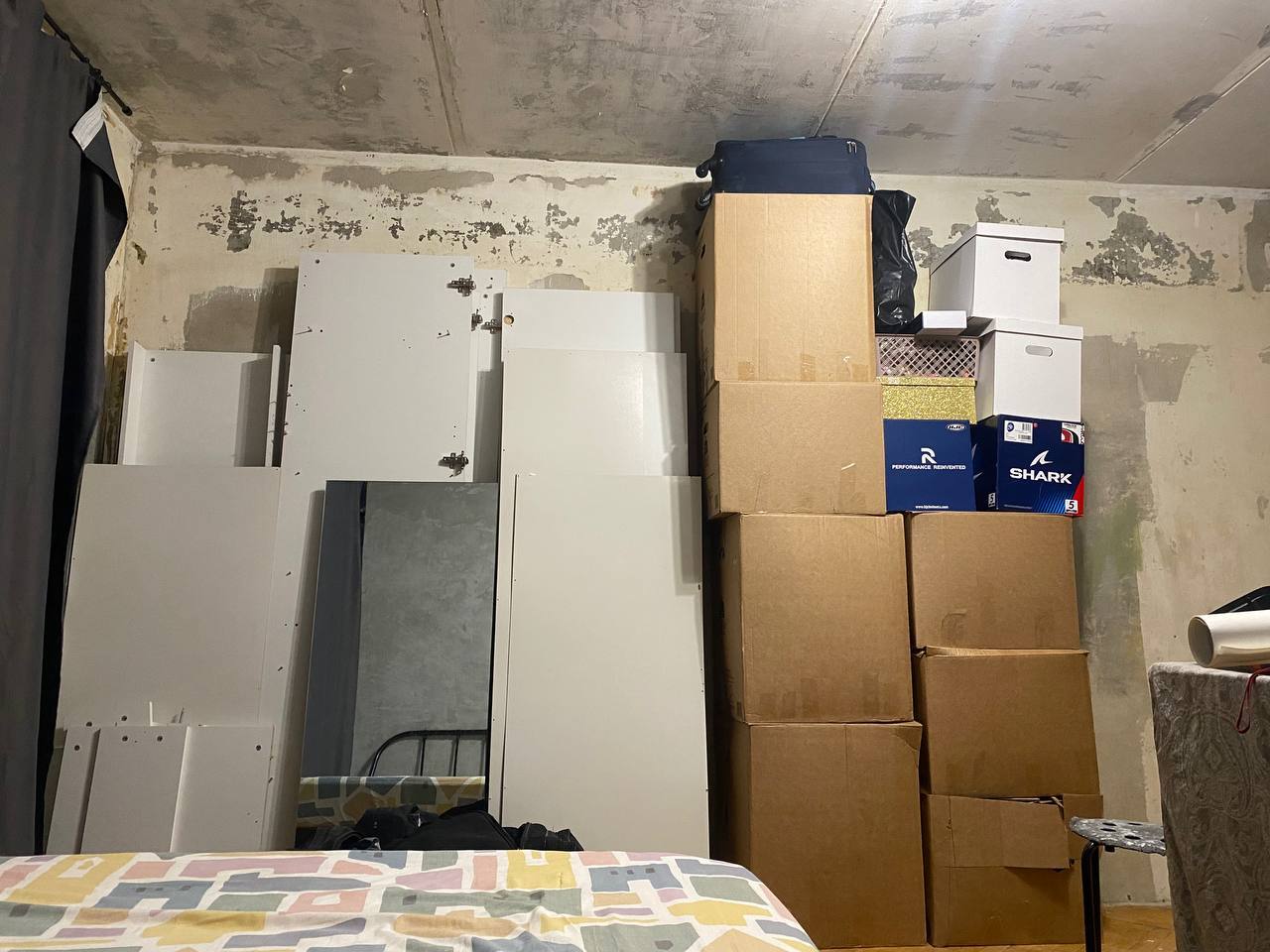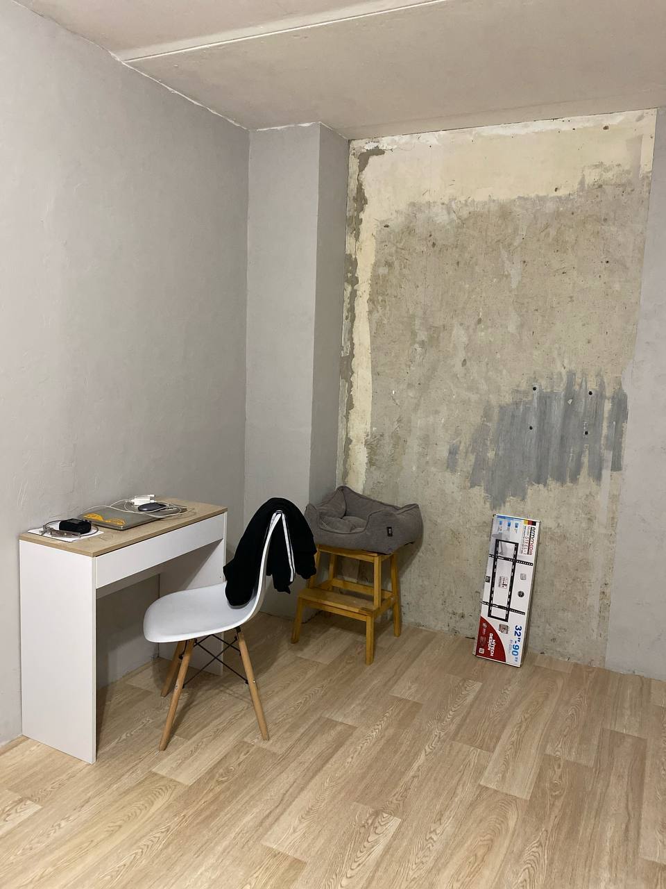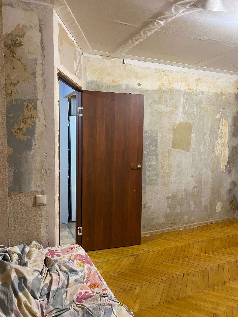 В какой-то момент все вещи переехали в коробки, мы разобрали шкаф и заштукатурили последний кусок стен, так что впереди был следующий этап - полы