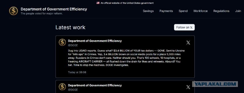 Есть несколько второсортных российских СМИ типа Царьграда или ТГ два майора, где напечатали эту новость, в них нет ссылок. Единственное похожее на пруф есть на ЯП, там есть скрин с сайта doge (прикреплю), но это странно, потому что все постится в Твиттере, можно было прикрепить прямую ссылку. Ну да ладно, на сайте doge за последний месяц такой новости нет, текст со скрина не гуглится.