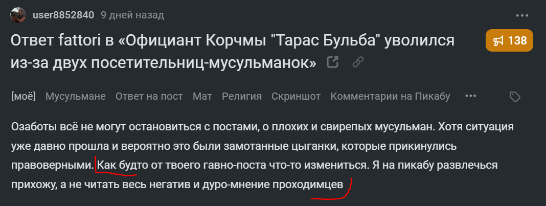 Ответ fattori в «Официант Корчмы "Тарас Бульба" уволился из-за двух посетительниц-мусульманок»