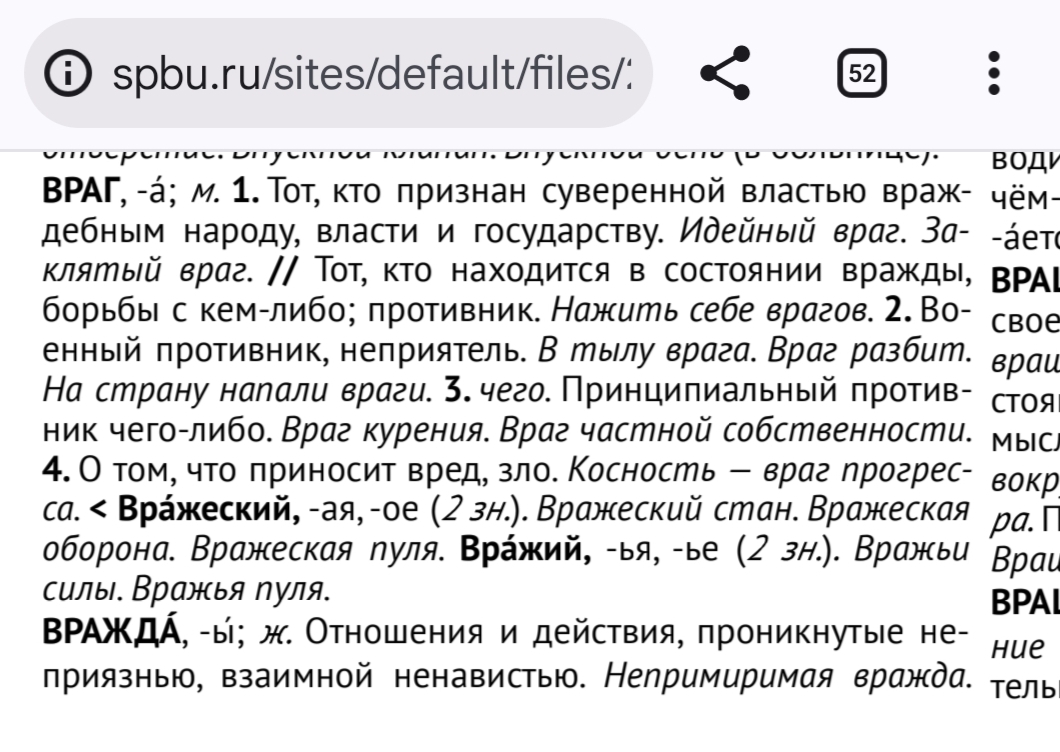 ВРАГ , -а́; 1. Тот, кто признан суверенной властью враждебным народу, власти и государству. Идейный враг. За-клятый враг. // Тот, кто находится в состоянии вражды, борьбы с кем-либо; противник. Нажить себе врагов. 2. Военный противник, неприятель. В тылу врага. Враг разбит. На страну напали враги. 3. чего. Принципиальный противник чего-либо. Враг курения. Враг частной собственности. 4. О том, что приносит вред, зло. Косность — враг прогресса. < Вра́жеский, -ая, -ое ( ) Вражеский стан. Вражеская оборона. Вражеская пуля. Вра́жий, -ья, -ье ( ) Вражьи силы. Вражья пуля.