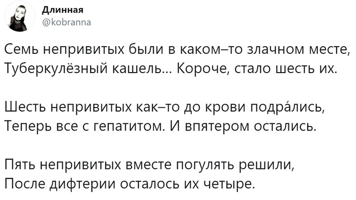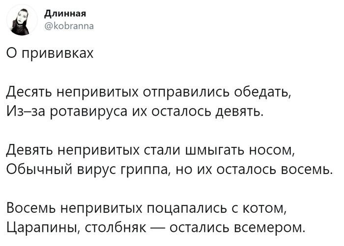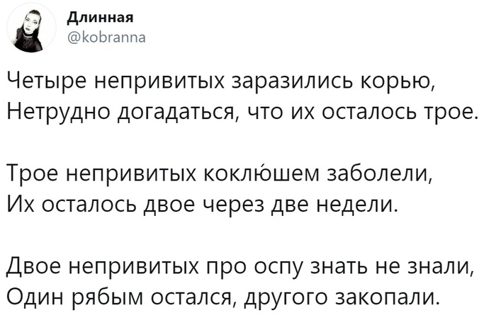 8546 Oldaiv 11 дней назад Ответ на пост «Минутка черного йумора»12 ну коль пошла тема про антипрививочников 1/4 Юмор Антипрививочники Ответ на пост Прививка (медицина) Повтор Волна постов Десять негритят Скриншот Стихи 1K 133 86 43 21 7 4 2 1 1 Ещё 5