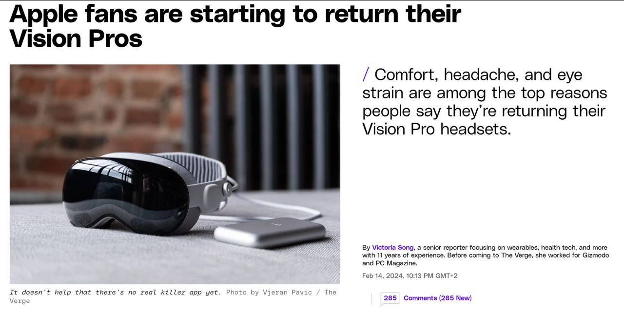 Apple позволяет вернуть любой продукт в течение 14 дней с момента покупки — и первая волна покупателей Vision Pro (который стоит 3500 долларов) как раз подошла к этому моменту.
